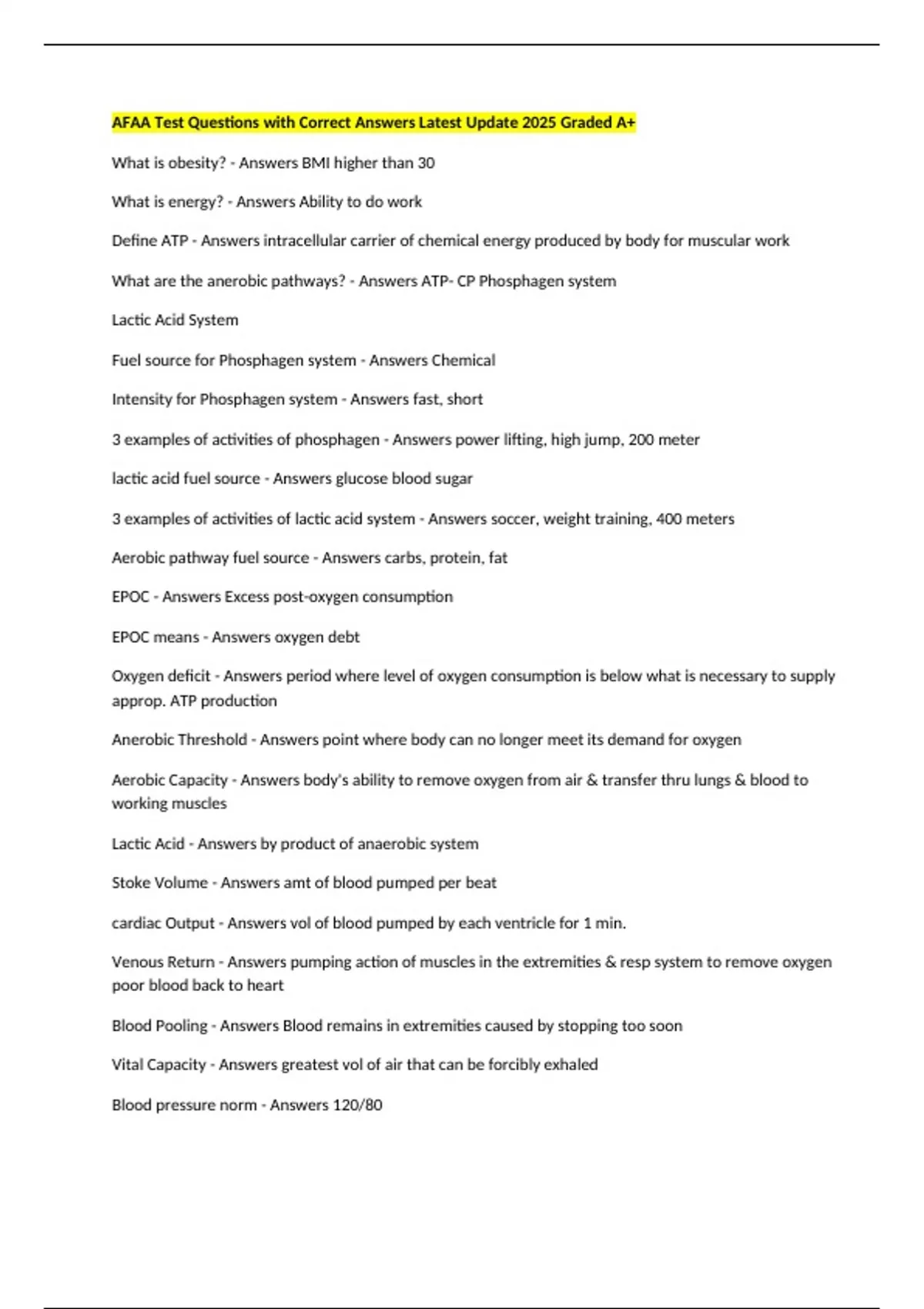 AFAA Test Questions with Correct Answers Latest Update 2025 Graded A+ What is obesity? - Answers BMI higher than 30 What is energy? - Answers Ability to do work Define ATP - Answers intracellular carrier of chemical energy produced by body for muscular work What are the anerobic pathways? - Answers ATP- CP Phosphagen system Lactic Acid System Fuel source for Phosphagen system - Answers Chemical Intensity for Phosphagen system - Answers fast, short 3 examples of activities of phosphagen - Answers power lifting, high jump, 200 meter lactic acid fuel source - Answers glucose blood sugar 3 examples of activities of lactic acid system - Answers soccer, weight training, 400 meters Aerobic pathway fuel source - Answers carbs, protein, fat EPOC - Answers Excess post-oxygen consumption EPOC means - Answers oxygen debt Oxygen deficit - Answers period where level of oxygen consumption is below what is necessary to supply approp. ATP production Anerobic Threshold - Answers point where body can no longer meet its demand for oxygen Aerobic Capacity - Answers body's ability to remove oxygen from air & transfer thru lungs & blood to working muscles Lactic Acid - Answers by product of anaerobic system Stoke Volume - Answers amt of blood pumped per beat cardiac Output - Answers vol of blood pumped by each ventricle for 1 min. Venous Return - Answers pumping action of muscles in the extremities & resp system to remove oxygen poor blood back to heart Blood Pooling - Answers Blood remains in extremities caused by stopping too soon Vital Capacity - Answers greatest vol of air that can be forcibly exhaled Blood pressure norm - Answers 120/80 Joint - Answers pt where 2 or more bones meet or articulate ligament - Answers fibrous tissues connect bone to bone tendon - Answers connect bone to muscle cartilage - Answers slippery, smooth minimize friction, maintained by synovial fluid anterior - Answers front