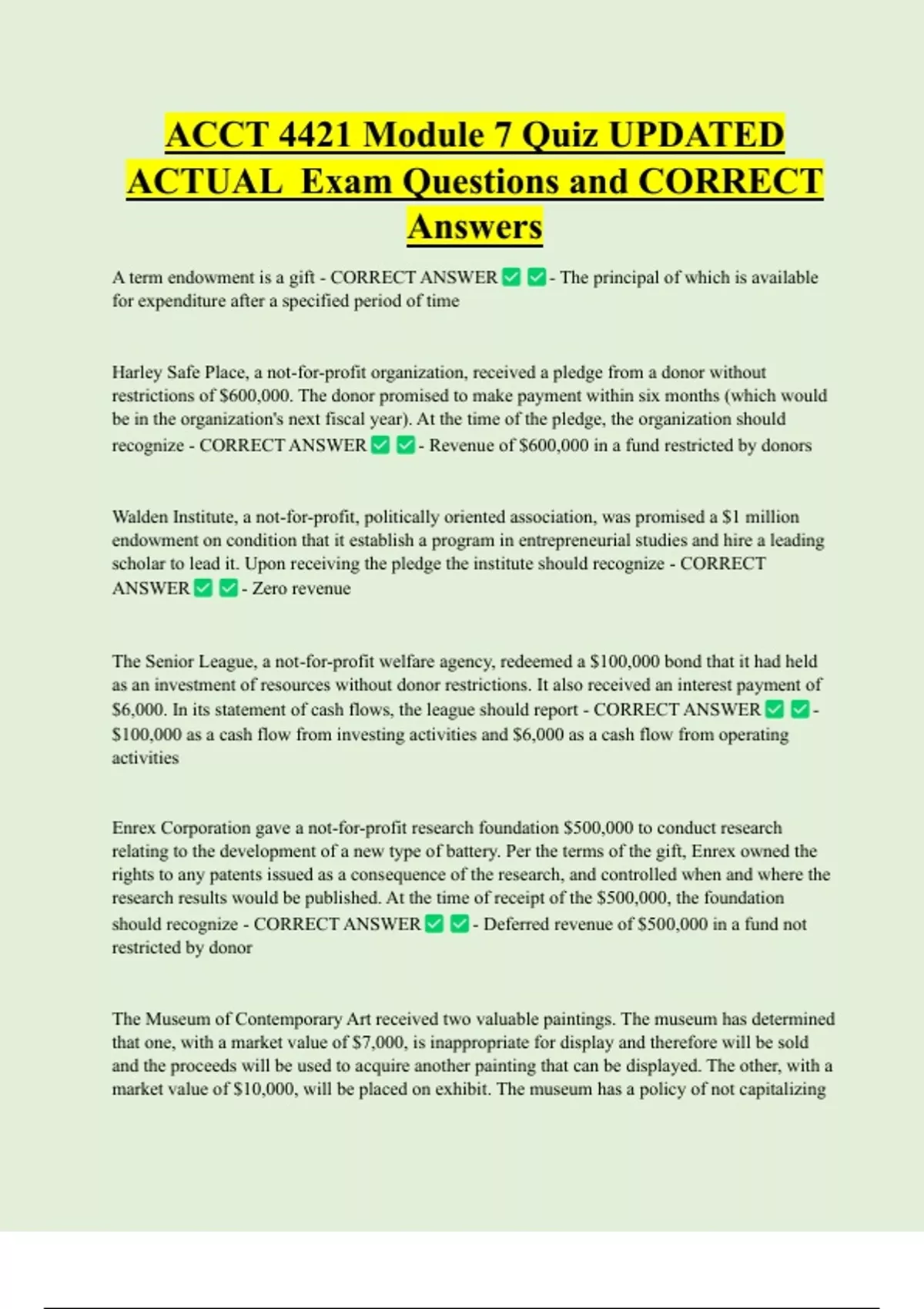 ACCT 4421 Module 7 Quiz UPDATED ACTUAL Exam Questions and CORRECT Answers A term endowment is a gift - CORRECT ANSWER for expenditure after a specified period of time - The principal of which is available Harley Safe Place, a not-for-profit organization, received a pledge from a donor without restrictions of $600,000. The donor promised to make payment within six months (which would be in the organization's next fiscal year). At the time of the pledge, the organization should recognize - CORRECT ANSWER - Revenue of $600,000 in a fund restricted by donors