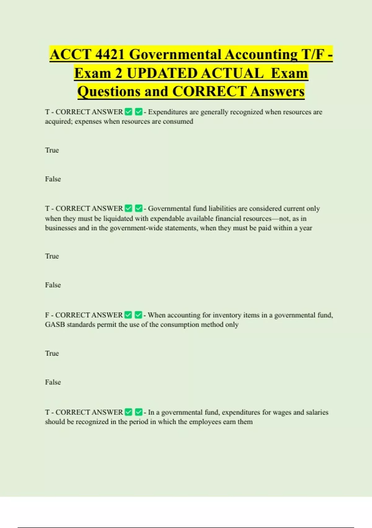 T - CORRECT ANSWER - Governmental fund liabilities are considered current only