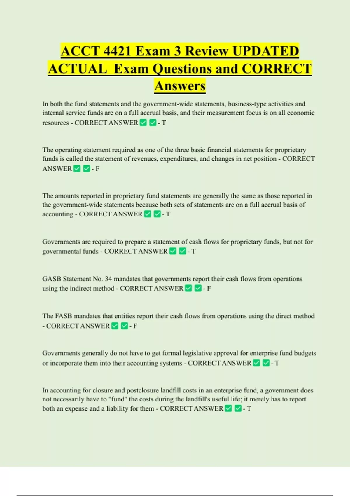 ACCT 4421 Exam 3 Review UPDATED ACTUAL Exam Questions and CORRECT Answers In both the fund statements and the government-wide statements, business-type activities and internal service funds are on a full accrual basis, and their measurement focus is on all economic resources - CORRECT ANSWER - T The operating statement required as one of the three basic financial statements for proprietary funds is called the statement of revenues, expenditures, and changes in net position - CORRECT ANSWER - F