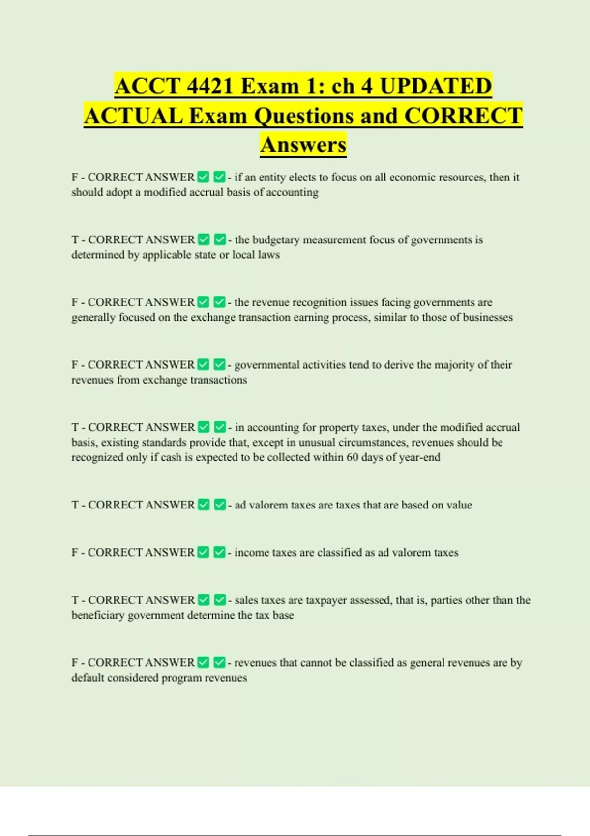 ACCT 4421 Exam 1: ch 4 UPDATED ACTUAL Exam Questions and CORRECT Answers F - CORRECT ANSWER - if an entity elects to focus on all economic resources, then it should adopt a modified accrual basis of accounting T - CORRECT ANSWER - the budgetary measurement focus of governments is determined by applicable state or local laws