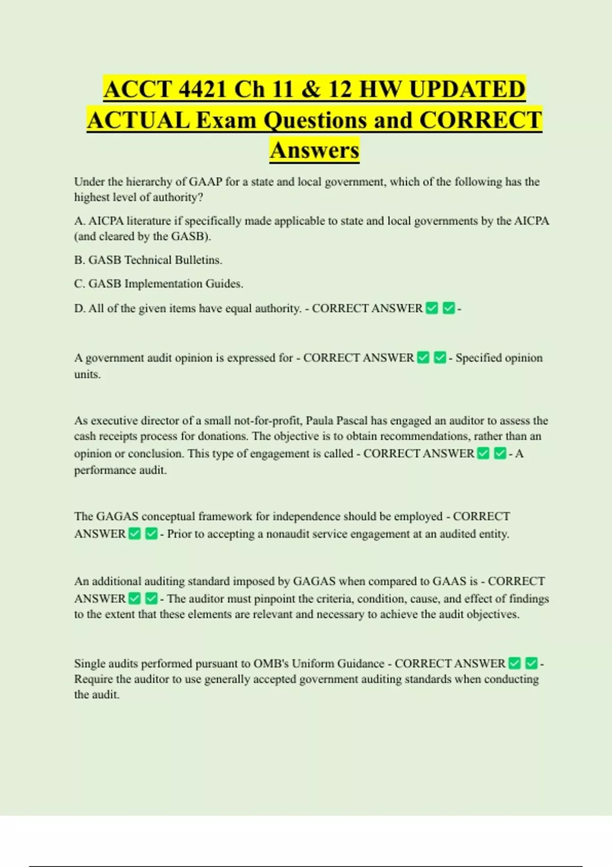 ACCT 4421 Ch 11 & 12 HW UPDATED ACTUAL Exam Questions and CORRECT Answers Under the hierarchy of GAAP for a state and local government, which of the following has the highest level of authority? A. AICPA literature if specifically made applicable to state and local governments by the AICPA (and cleared by the GASB). B. GASB Technical Bulletins. C. GASB Implementation Guides. D. All of the given items have equal authority. - CORRECT ANSWER A government audit opinion is expressed for - CORRECT ANSWER units. -