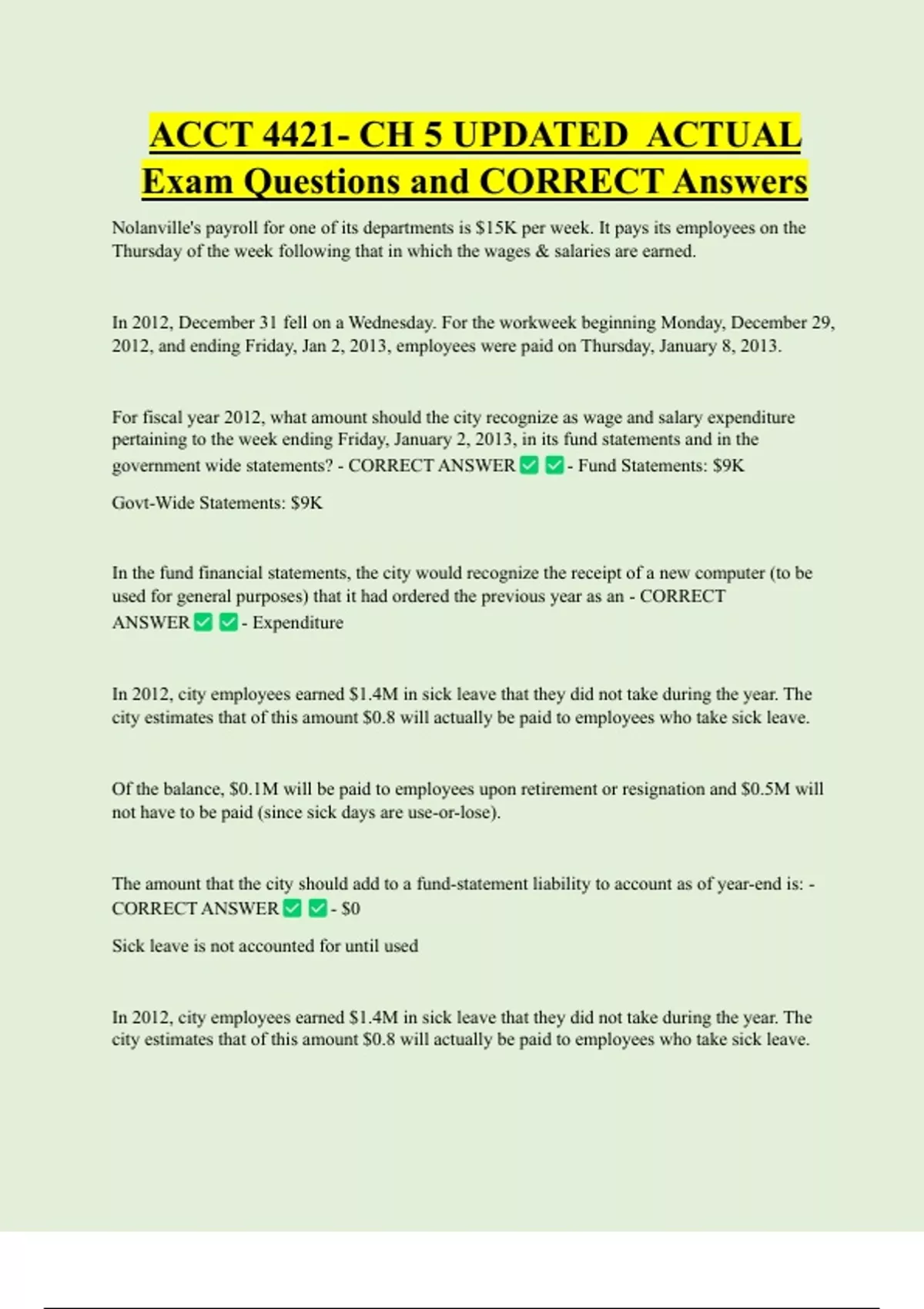 ACCT 4421- CH 5 UPDATED ACTUAL Exam Questions and CORRECT Answers Nolanville's payroll for one of its departments is $15K per week. It pays its employees on the Thursday of the week following that in which the wages & salaries are earned. In 2012, December 31 fell on a Wednesday. For the workweek beginning Monday, December 29, 2012, and ending Friday, Jan 2, 2013, employees were paid on Thursday, January 8, 2013.