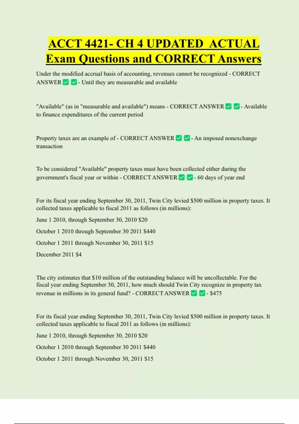 ACCT 4421- CH 4 UPDATED ACTUAL Exam Questions and CORRECT Answers Under the modified accrual basis of accounting, revenues cannot be recognized - CORRECT ANSWER - Until they are measurable and available "Available" (as in "measurable and available") means - CORRECT ANSWER to finance expenditures of the current period Property taxes are an example of - CORRECT ANSWER - Available - An imposed nonexchange transaction