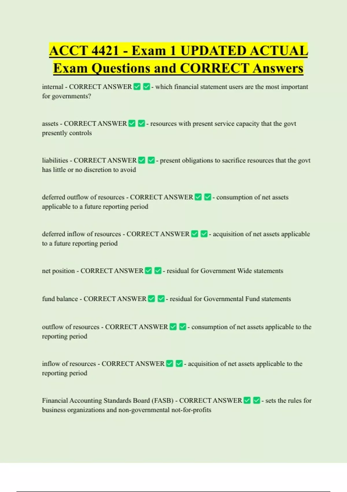 ACCT 4421 - Exam 1 UPDATED ACTUAL Exam Questions and CORRECT Answers internal - CORRECT ANSWER for governments? assets - CORRECT ANSWER presently controls liabilities - CORRECT ANSWER has little or no discretion to avoid - which financial statement users are the most important - resources with present service capacity that the govt - pre