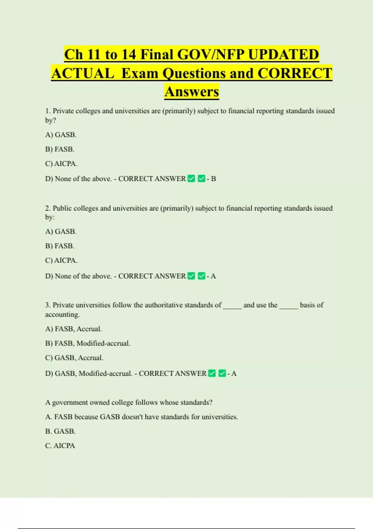 Ch 11 to 14 Final GOV/NFP UPDATED ACTUAL Exam Questions and CORRECT Answers 1. Private colleges and universities are (primarily) subject to financial reporting standards issued by? A) GASB. B) FASB. C) AICPA. D) None of the above. - CORRECT ANSWER - B