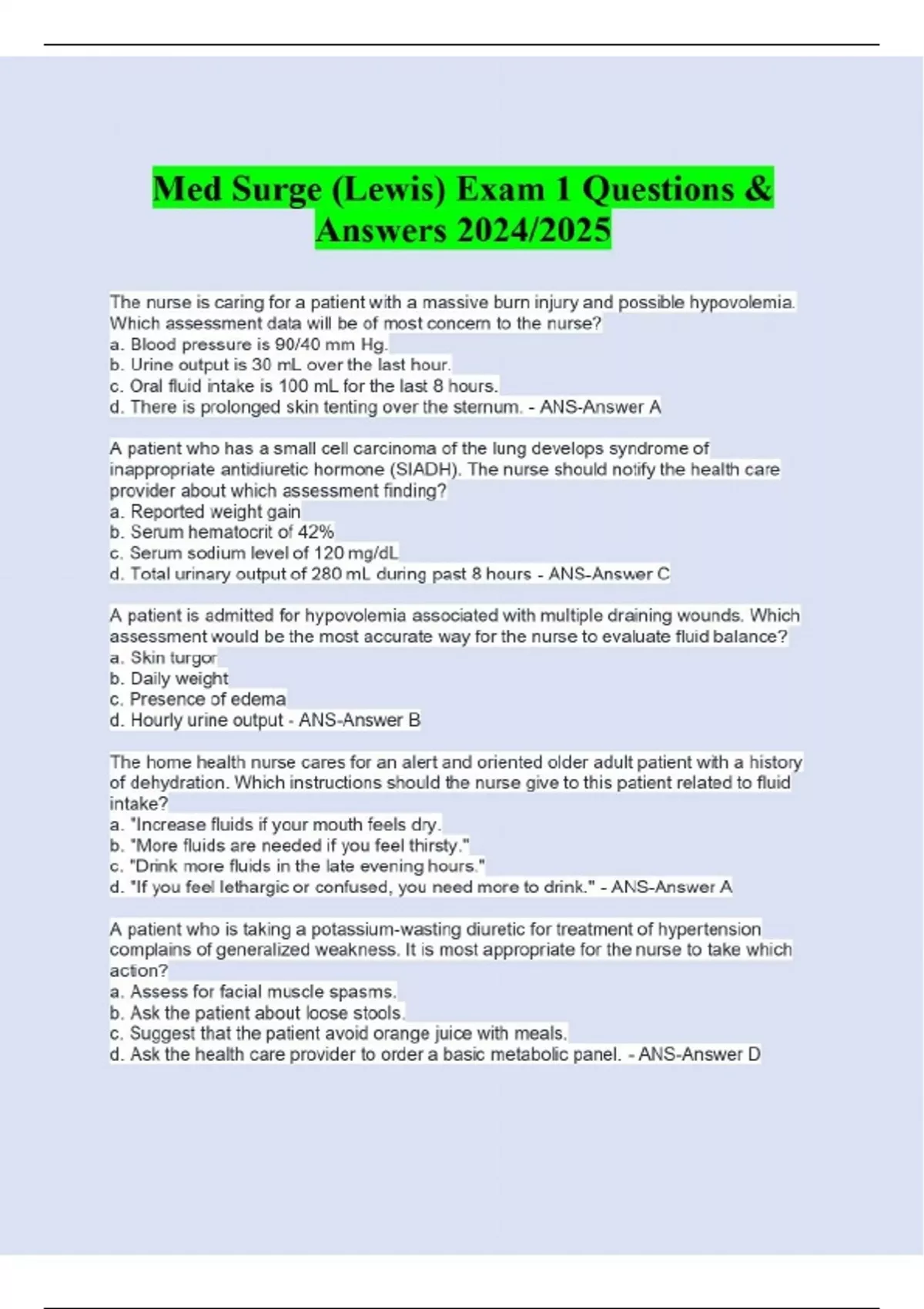 Med Surge (Lewis) Exam 1 Questions & Answers 2024/2025 The nurse is caring for a patient with a massive burn injury and possible hypovolemia. Which assessment data will be of most concern to the nurse? a. Blood pressure is 90/40 mm Hg. b. Urine output is 30 mL over the last hour. c. Oral fluid intake is 100 mL for the last 8 hours. d. There is prolonged skin tenting over the sternum. - ANS-Answer A A patient who has a small cell carcinoma of the lung develops syndrome of inappropriate antidiuretic hormone (SIADH). The nurse should notify the health care provider about which assessment finding? a. Reported weight gain b. Serum hematocrit of 42% c. Serum sodium level of 120 mg/dL d. Total urinary output of 280 mL during past 8 hours - ANS-Answer C A patient is admitted for hypovolemia associated with multiple draining wounds. Which assessment would be the most accurate way for the nurse to evaluate fluid balance? a. Skin turgor b. Daily weight c. Presence of edema d. Hourly urine output - ANS-Answer B The home health nurse cares for an alert and oriented older adult patient with a history of dehydration. Which instructions should the nurse give to this patient related to fluid intake? a. "Increase fluids if your mouth feels dry. b. "More fluids are needed if you feel thirsty." c. "Drink more fluids in the late evening hours." d. "If you feel lethargic or confused, you need more to drink." - ANS-Answer A A patient who is taking a potassium-wasting diuretic for treatment of hypertension complains of generalized weakness. It is most appropriate for the nurse to take which action? a. Assess for facial muscle spasms. b. Ask the patient about loose stools. c. Suggest that the patient avoid orange juice with meals. d. Ask the health care provider to order a basic metabolic panel. - ANS-Answer D Spironolactone (Aldactone), an aldosterone antagonist, is prescribed for a patient. Which statement by the patient indicates that the teaching about this medication has been effective? a. "I will try to drink at least 8 glasses of water every day." b. "I will use a salt substitute to decrease my sodium intake." c. "I will increase my intake of potassium-containing foods." d. "I will drink apple juice instead of orange juice for breakfast." - ANS-Answer D A newly admitted patient is diagnosed with hyponatremia. When making room assignments, the charge nurse should take which action? a. Assign the patient to a room near the nurse's station. b. Place the patient in a room nearest to the water fountain. c. Place the patient on telemetry to monitor for peaked T waves. d. Assign the patient to a semi-private room and place an order for a low-salt diet. - ANS-Answer A IV potassium chloride (KCl) 60 mEq is prescribed for treatment of a patient with severe hypokalemia. Which action should the nurse take? a. Administer the KCl as a rapid IV bolus. b. Infuse the KCl at a rate of 10 mEq/hour. c. Only give the KCl through a central venous line. d. Discontinue cardiac monitoring during the infusion. - ANS-Answer B A postoperative patient who had surgery for a perforated gastric ulcer has been receiving nasogastric suction for 3 days. The patient now has a serum sodium level of 127 mEq/L (127 mmol/L). Which prescribed therapy should the nurse question? a. Infuse 5% dextrose in water at 125 mL/hr. b. Administer IV morphine sulfate 4 mg every 2 hours PRN. c. Give IV metoclopramide (Reglan) 10 mg every 6 hours PRN for nausea. d. Administer 3% saline if serum sodium decreases to less than 128 mEq/L. - ANS-Answer A A patient who was involved in a motor vehicle crash has had a tracheostomy placed to allow for continued mechanical ventilation. How should the nurse interpret the following arterial blood gas results: pH 7.48, PaO2 85 mm Hg, PaCO2 32 mm Hg, and HCO3 25 mEq/L? a. Metabolic acidosis b. Metabolic alkalosis c. Respiratory acidosis d. Respiratory alkalosis - ANS-Answer D The nurse notes that a patient who was admitted with diabetic ketoacidosis has rapid, deep respirations. Which action should the nurse take? a. Give the prescribed PRN lorazepam (Ativan). b. Start the prescribed PRN oxygen at 2 to 4 L/min. c. Administer the prescribed normal saline bolus and insulin. d. Encourage the patient to take deep, slow breaths with guided imagery. - ANS-Answer C An older adult patient who is malnourished presents to the emergency department with a serum protein level of 5.2 g/dL. The nurse would expect which clinical manifestation? a. Pallor b. Edema c. Confusion d. Restlessness - ANS-Answer B A patient receives 3% NaCl solution for correction of hyponatremia. Which assessment is most important for the nurse to monitor for while the patient is receiving this infusion? a. Lung sounds b. Urinary output c. Peripheral pulses d. Peripheral edema - ANS-Answer A Hypertonic solutions cause water retention, so the patient should be monitored for symptoms of fluid excess. Crackles in the lungs may indicate the onset of pulmonary edema and are a serious manifestation of fluid excess. Bounding peripheral pulses, peripheral edema, or changes in urine output are also important to monitor when administering hypertonic solutions, but they do not indicate acute respiratory or cardiac decompensation. The long-term care nurse is evaluating the effectiveness of protein supplements for an older resident who has a low serum total protein level. Which assessment finding indicates that the patient's condition has improved? a. Hematocrit 28% b. Absence of skin tenting c. Decreased peripheral edema d. Blood pressure 110/72 mm Hg - ANS-Answer C Edema is caused by low oncotic pressure in individuals with low serum protein levels. The decrease in edema indicates an improvement in the patient's protein status. Good skin turgor is an indicator of fluid balance, not protein status. A low hematocrit could be caused by poor protein intake. Blood pressure does not provide a useful clinical tool for monitoring protein status. continues...