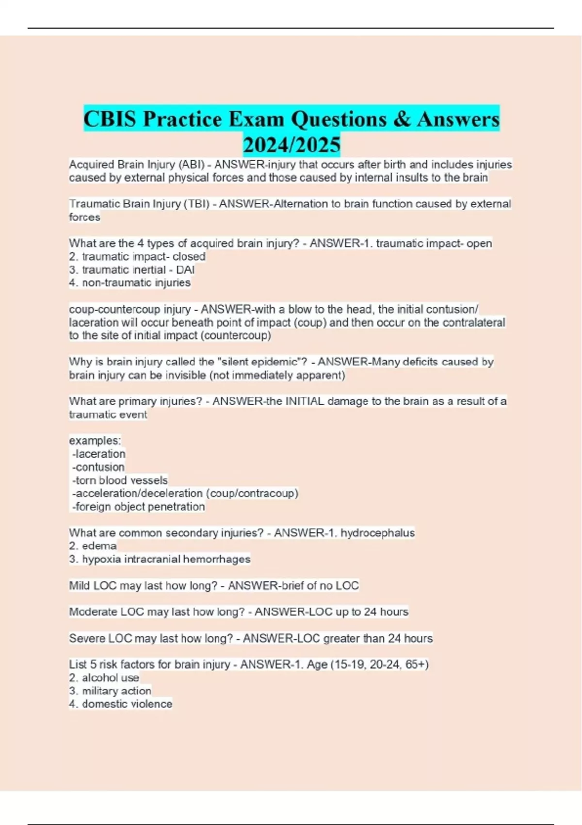 CBIS Practice Exam Questions & Answers 2024/2025 Acquired Brain Injury (ABI) - ANSWER-injury that occurs after birth and includes injuries caused by external physical forces and those caused by internal insults to the brain Traumatic Brain Injury (TBI) - ANSWER-Alternation to brain function caused by external forces What are the 4 types of acquired brain injury? - ANSWER-1. traumatic impact- open 2. traumatic impact- closed 3. traumatic inertial - DAI 4. non-traumatic injuries coup-countercoup injury - ANSWER-with a blow to the head, the initial contusion/ laceration will occur beneath point of impact (coup) and then occur on the contralateral to the site of initial impact (countercoup) Why is brain injury called the "silent epidemic"? - ANSWER-Many deficits caused by brain injury can be invisible (not immediately apparent) What are primary injuries? - ANSWER-the INITIAL damage to the brain as a result of a traumatic event examples: -laceration -contusion -torn blood vessels -acceleration/deceleration (coup/contracoup) -foreign object penetration What are common secondary injuries? - ANSWER-1. hydrocephalus 2. edema 3. hypoxia intracranial hemorrhages Mild LOC may last how long? - ANSWER-brief of no LOC Moderate LOC may last how long? - ANSWER-LOC up to 24 hours Severe LOC may last how long? - ANSWER-LOC greater than 24 hours List 5 risk factors for brain injury - ANSWER-1. Age (15-19, 20-24, 65+) 2. alcohol use 3. military action 4. domestic violence 5. prisons 6. sport-injury Age Groups with Highest Rates of Brain Injury due to Falls - ANSWER-(0-4 years old) 50% of all TBIs (65+ years old) 61% of all TBIs Age Group with Highest Rate of Death from TBI - ANSWER-Adults 75+ years old Highest Rates of Death from TBI (all causes) - ANSWER-Adults 75+ years old Highest Rates of Death from TBI (Firearms) - ANSWER-Adults 20-24 years old and Adults 75+ years old Percentage of Children with TBI from Physical Abuse - ANSWER-67% (0-3 years old) Highest Rate of TBI from MVAs - ANSWER-Adults 20-24 years old Highest Rates of TBI Deaths from MVAs - ANSWER-Teenagers 16-19 years old Is the progression along the continuum of care linear? - ANSWER-No, due to risk factors, comorbidities, medical complications, treatment options, funding, etc. Who establishes standards for rehabilitation facilities? - ANSWER-Commission on Accreditation of Rehabilitation Facilities (CARF) Olmstead Decision - ANSWER-Requires states to administer services, programs, and activities, in the most integrated setting appropriate to the needs of individuals with disabilities. - increased opportunities for federal and state initiatives that make community living more accessible What agency funds the TBI Model Systems? - ANSWER-US Dept of Health and Human Services Why is TBIMS data important? - ANSWER-increases understanding of recovery and outcomes of TBI via longitudinal studies What is meant by disease-causative and disease- alternative? - ANSWER-Brain injuries due not maintain a static state. TBI can both cause disease or accelerate disease down the road. Chronic progressive conditions. These 4 conditions cause individuals with brain injury to be at an increased risk of death (4 reasons) - ANSWER-1. seizures 2. pneumonia 3. respiratory problems 4. circulatory problems Name 2 neurological conditions associated with brain injury - ANSWER-1. epilepsy 2. Alzheimer's - CTE Name 3 neuro-endocrine disorders associated with brain injury - ANSWER-1. Growth Hormone insufficiency 2. Hypothyroidism (low thyroid function) 3. Gonadotropin deficiency P-A-D (meninges) - ANSWER-1. pia mater 2. arachnoid 3. dura mater What are the 3 parts of a neuron? - ANSWER-1. cell body 2. axon 3. dendrites What is the function of the blood brain barrier? - ANSWER-Ensures that harmful substances cannot pass through the membrane and harm the brain Synaptic cleft - ANSWER-Area for which neurotransmitter can cross from cell to cell when action potentials are triggered Medulla - ANSWER-Controls involuntary functions (HR, BP, swallow) Injury to this area can threaten life immediately Pons - ANSWER-Enables thinking part of brain to work with the movement part of the brain Consequences of injury can cause loss of ability to coordinate/ control body movements Midbrain - ANSWER-seeing and hearing functions, alertness and arousal Consequences of injury to this area can cause damage BP, sleep/wake cycle, breathing function - can lead to DOC injury Continues...
