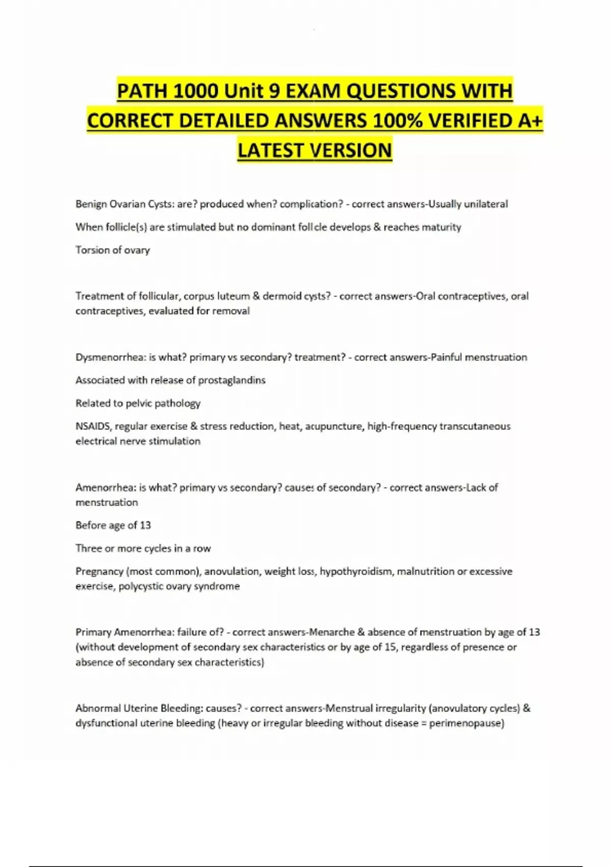PATH 1000 Unit 9 EXAM QUESTIONS WITH CORRECT DETAILED ANSWERS 100% VERIFIED A+ LATEST VERSION Benign Ovarian Cysts: are? produced when? complication? - correct answers-Usually unilateral When follicle(s) are stimulated but no dominant follicle develops & reaches maturity Torsion of ovary Treatment of follicular, corpus luteum & dermoid cysts? - correct answers-Oral contraceptives, oral contraceptives, evaluated for removal Dysmenorrhea: is what? primary vs secondary? treatment? - correct answers-Painful menstruation Associated with release of prostaglandins Related to pelvic pathology NSAIDS, regular exercise & stress reduction, heat, acupuncture, high-frequency transcutaneous electrical nerve stimulation Amenorrhea: is what? primary vs secondary? causes of secondary? - correct answers-Lack of menstruation Before age of 13 Three or more cycles in a row Pregnancy (most common), anovulation, weight loss, hypothyroidism, malnutrition or excessive exercise, polycystic ovary syndrome Primary Amenorrhea: failure of? - correct answers-Menarche & absence of menstruation by age of 13 (without development of secondary sex characteristics or by age of 15, regardless of presence or absence of secondary sex characteristics) Abnormal Uterine Bleeding: causes? - correct answers-Menstrual irregularity (anovulatory cycles) & dysfunctional uterine bleeding (heavy or irregular bleeding without disease = perimenopause)