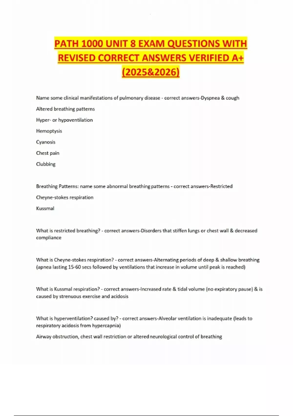 PATH 1000 UNIT 8 EXAM QUESTIONS WITH REVISED CORRECT ANSWERS VERIFIED A+ (2025&2026) Name some clinical manifestations of pulmonary disease - correct answers-Dyspnea & cough Altered breathing patterns Hyper- or hypoventilation Hemoptysis Cyanosis Chest pain Clubbing Breathing Patterns: name some abnormal breathing patterns - correct answers-Restricted Cheyne-stokes respiration Kussmal What is restricted breathing? - correct answers-Disorders that stiffen lungs or chest wall & decreased compliance What is Cheyne-stokes respiration? - correct answers-Alternating periods of deep & shallow breathing (apnea lasting 15-60 secs followed by ventilations that increase in volume until peak is reached) What is Kussmal respiration? - correct answers-Increased rate & tidal volume (no expiratory pause) & is caused by strenuous exercise and acidosis What is hyperventilation? caused by? - correct answers-Alveolar ventilation is inadequate (leads to respiratory acidosis from hypercapnia) Airway obstruction, chest wall restriction or altered neurological control of breathing