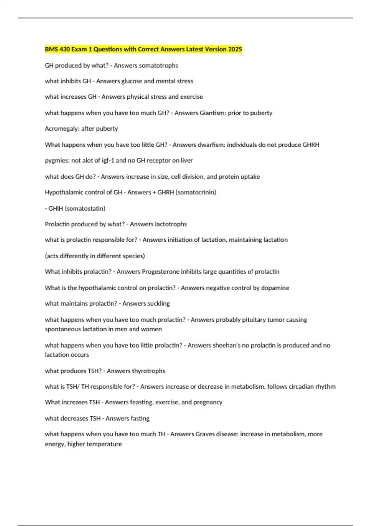 BMS 430 Exam 1 Questions with Correct Answers Latest Version 2025 GH produced by what? - Answers somatotrophs what inhibits GH - Answers glucose and mental stress what increases GH - Answers physical stress and exercise what happens when you have too much GH? - Answers Giantism: prior to puberty Acromegaly: after puberty What happens when you have too little GH? - Answers dwarfism: individuals do not produce GHRH pygmies: not alot of igf-1 and no GH receptor on liver what does GH do? - Answers increase in size, cell division, and protein uptake Hypothalamic control of GH - Answers + GHRH (somatocrinin) - GHIH (somatostatin) Prolactin produced by what? - Answers lactotrophs what is prolactin responsible for? - Answers initiation of lactation, maintaining lactation (acts differently in different species) What inhibits prolactin? - Answers Progesterone inhibits large quantities of prolactin What is the hypothalamic control on prolactin? - Answers negative control by dopamine what maintains prolactin? - Answers suckling what happens when you have too much prolactin? - Answers probably pituitary tumor causing spontaneous lactation in men and women what happens when you have too little prolactin? - Answers sheehan's no prolactin is produced and no lactation occurs what produces TSH? - Answers thyrotrophs what is TSH/ TH responsible for? - Answers increase or decrease in metabolism, follows circadian rhythm What increases TSH - Answers feasting, exercise, and pregnancy what decreases TSH - Answers fasting what happens when you have too much TH - Answers Graves disease: increase in metabolism, more energy, higher temperature what happens when you have too little TH - Answers Cretinism in fetus: mental retardation and nervous system issues