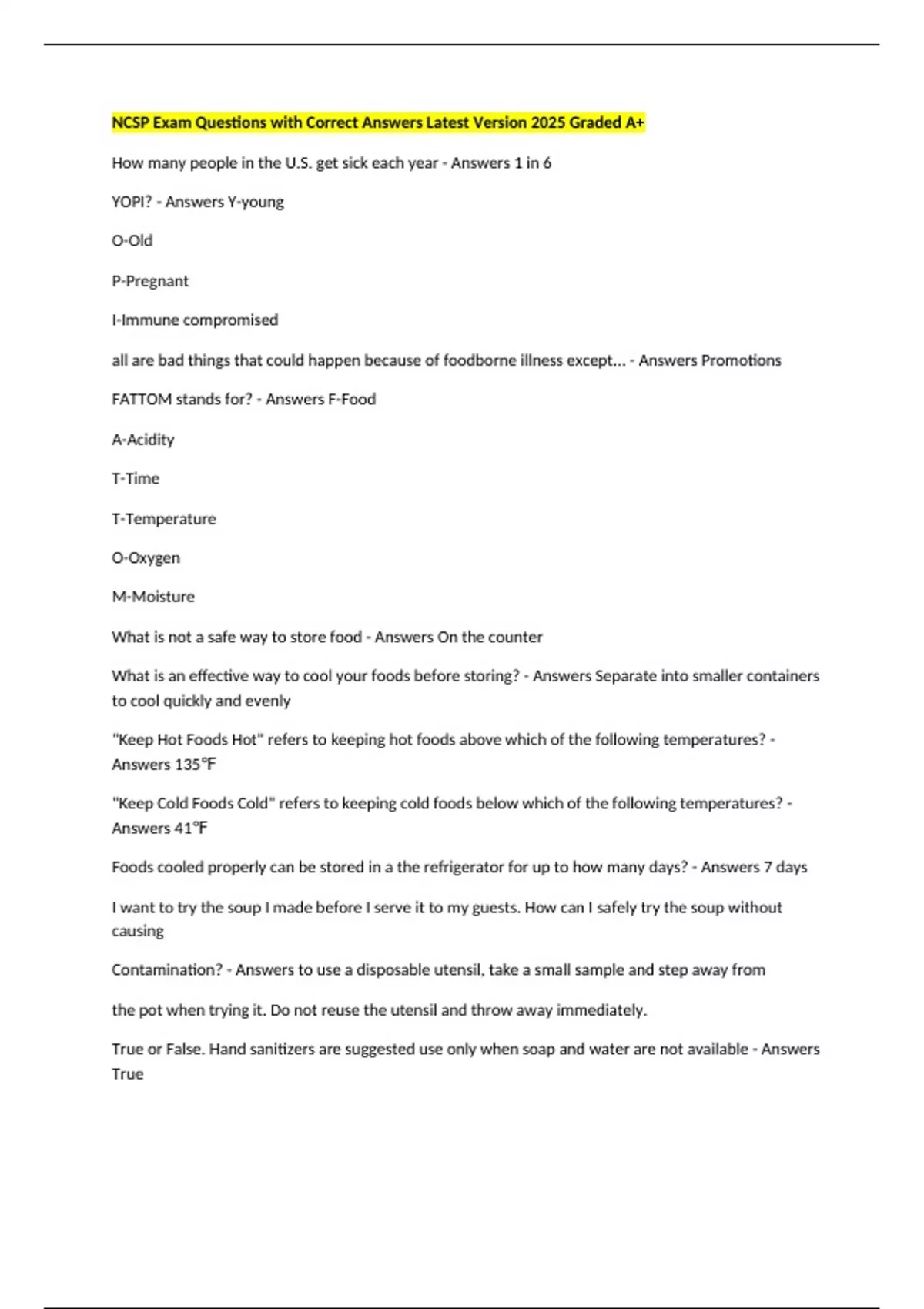 NCSP Exam Questions with Correct Answers Latest Version 2025 Graded A+ How many people in the U.S. get sick each year - Answers 1 in 6 YOPI? - Answers Y-young O-Old P-Pregnant I-Immune compromised all are bad things that could happen because of foodborne illness except... - Answers Promotions FATTOM stands for? - Answers F-Food A-Acidity T-Time T-Temperature O-Oxygen M-Moisture What is not a safe way to store food - Answers On the counter What is an effective way to cool your foods before storing? - Answers Separate into smaller containers to cool quickly and evenly "Keep Hot Foods Hot" refers to keeping hot foods above which of the following temperatures? - Answers 135℉ "Keep Cold Foods Cold" refers to keeping cold foods below which of the following temperatures? - Answers 41℉ Foods cooled properly can be stored in a the refrigerator for up to how many days? - Answers 7 days I want to try the soup I made before I serve it to my guests. How can I safely try the soup without causing Contamination? - Answers to use a disposable utensil, take a small sample and step away from the pot when trying it. Do not reuse the utensil and throw away immediately. True or False. Hand sanitizers are suggested use only when soap and water are not available - Answers True