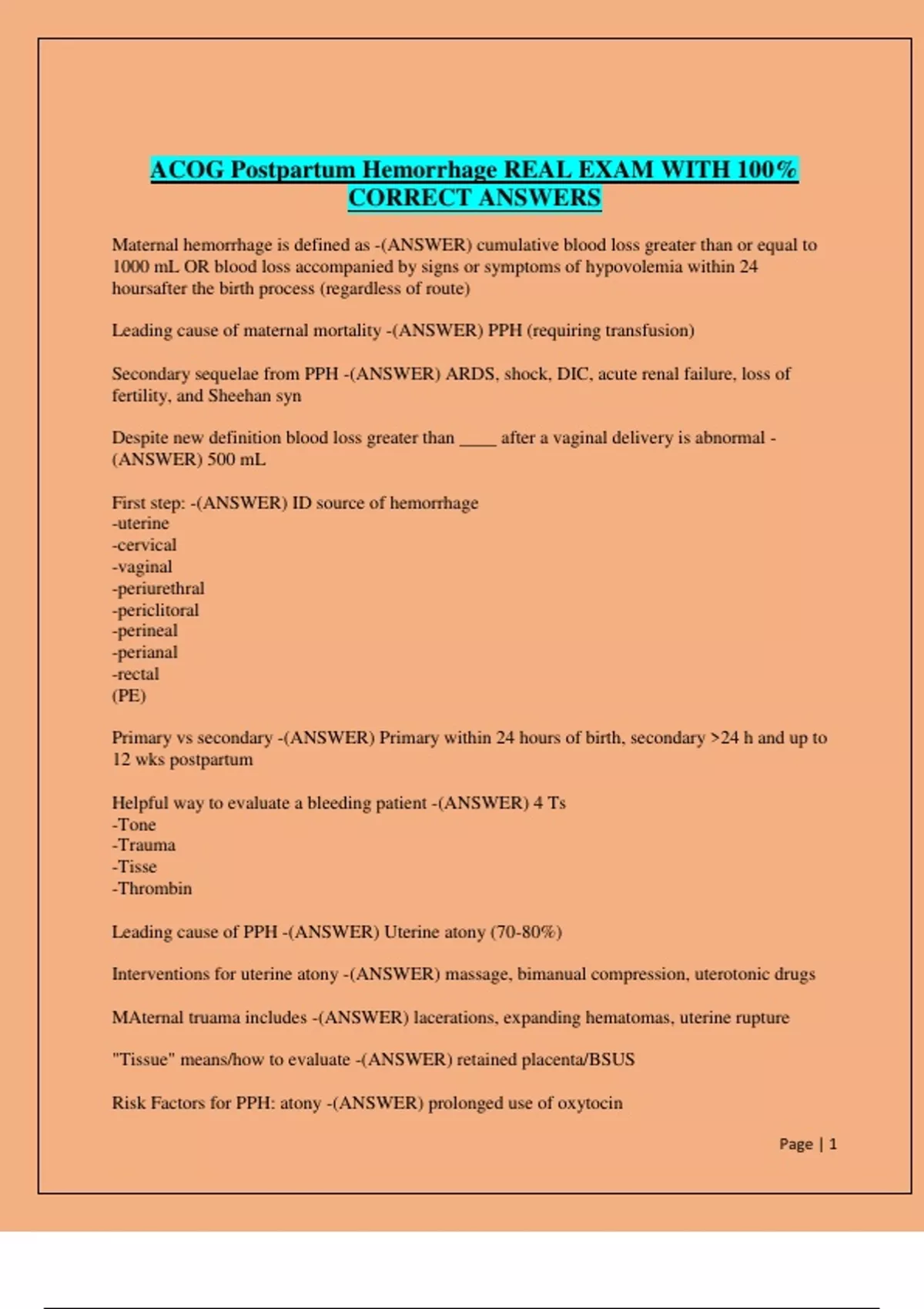 ACOG Postpartum Hemorrhage REAL EXAM WITH 100%