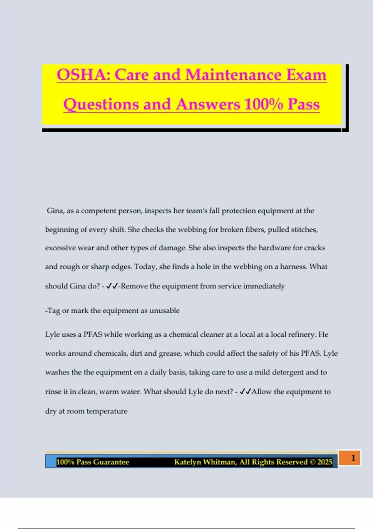 OSHA: Care and Maintenance Exam Questions and Answers 100% Pass Gina, as a competent person, inspects her team's fall protection equipment at the beginning of every shift. She checks the webbing for broken fibers, pulled stitches, excessive wear and other types of damage. She also inspects the hardware for cracks and rough or sharp edges. Today, she finds a hole in the webbing on a harness. What should Gina do? - -Remove the equipment from service immediately -Tag or mark the equipment as unusable Lyle uses a PFAS while working as a chemical cleaner at a local at a local refinery. He works around chemicals, dirt and grease, which could affect the safety of his PFAS. Lyle washes the the equipment on a daily basis, taking care to use a mild detergent and to rinse it in clean, warm water. What should Lyle do next? - Allow the equipment to dry at room temperature