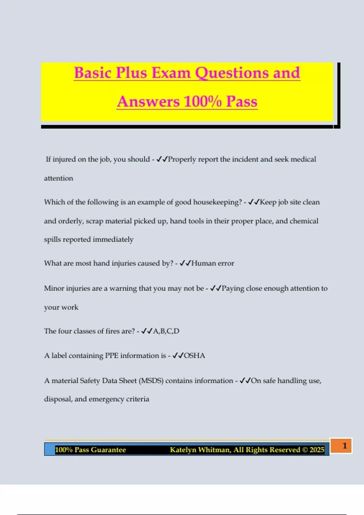 Basic Plus Exam Questions and Answers 100% Pass If injured on the job, you should - Properly report the incident and seek medical attention Which of the following is an example of good housekeeping? - Keep job site clean and orderly, scrap material picked up, hand tools in their proper place, and chemical spills reported immediately What are most hand injuries caused by? - Human error Minor injuries are a warning that you may not be - Paying close enough attention to your work The four classes of fires are? - A,B,C,D A label containing PPE information is - OSHA A material Safety Data Sheet (MSDS) contains information - On safe handling use, disposal, and emergency criteria 2100% Pass Guarantee Katelyn Whitman, All Rights Reserved © 2025 All chemical containers must - have appropriate warning labels The purpose of the NFPA and the HMIS labels are to communicate - Hazards information about chemicals When selecting your protective equipment make sure you select: - A level of protection greater than the minimum required Which of the following statements is true? - Beards, hair, and glasses can interfere with a proper fit Employees shall be instructed in respiratorr - All of the above Employees using Personal Protective Equipment must be aware: - Of all warning labels for and limitations of their PPE Personal Protective Equipment that fits poorly will - Not provide the necessary protection Pick the item below that must be adjusted to fit you properly - hardhat