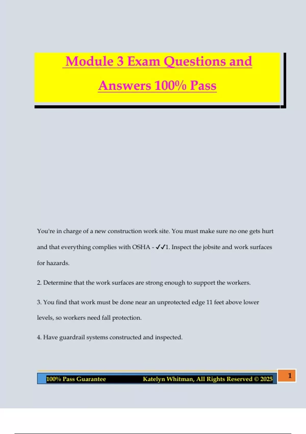 Module 3 Exam Questions and Answers 100% Pass You're in charge of a new construction work site. You must make sure no one gets hurt and that everything complies with OSHA - 1. Inspect the jobsite and work surfaces for hazards. 2. Determine that the work surfaces are strong enough to support the workers. 3. You find that work must be done near an unprotected edge 11 feet above lower levels, so workers need fall protection. 4. Have guardrail systems constructed and inspected. 2100% Pass Guarantee Katelyn Whitman, All Rights Reserved © 2025 5. Select and inspect the correct personal fall arrest systems, and make sure workers know how to use them. 6. Begin work and ensure workers follow safe work procedures. Safe Practices - Personal Fall Arrest System - There is a hoisting area without guardrails Equipment Guards - Workers are working four feet above paving equipment Fences - An eight-foot-deep hole is hidden by overgrown grasses. Warning Line and Safety Monitoring Systems - Roofers are working on low-slope roofs with unprotected sides Hardhats and Barricades - Workers may be hit by falling tools and materials Numbers to Remember - 1. Guardrail systems must be able to withstand a force of at least 200 lbs at any point along the top edge 2. For pipe railings, posts shall be spaced not more than 8 feet apart on centers 3. A safety net's maximum mesh openings must not be longer than 6 inches on any side 4. Top rails must be 42 inches, plus or minus 3 inches, above the walking/working level 5. Intermediate members such as balusters, when used between posts, shall not be more than 19 inches apart 6. Safety net drop-tests must consist of a 400 lbs bag of sand being drop
