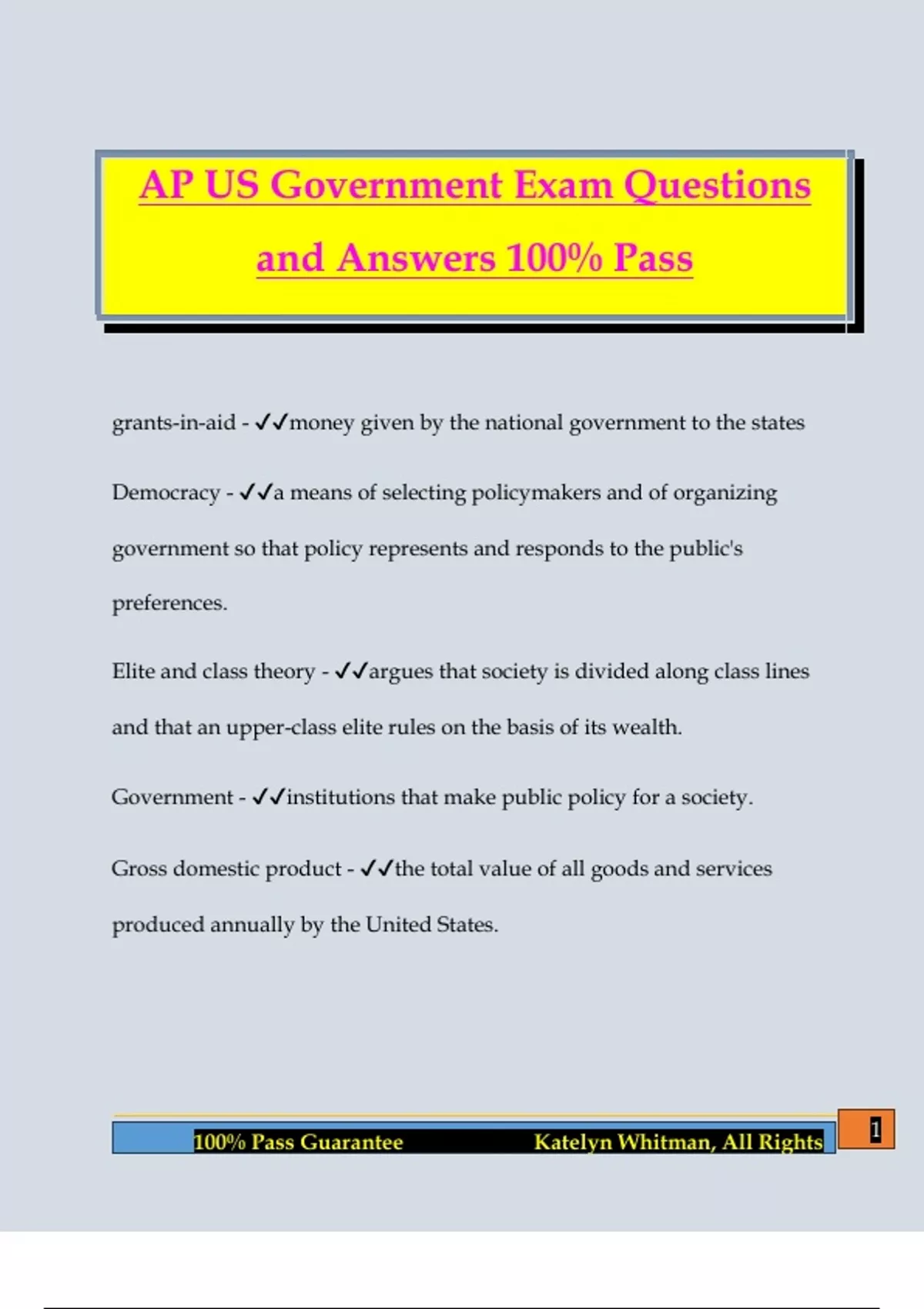 AP US Government Exam Questions and Answers 100% Pass grants-in-aid - money given by the national government to the states Democracy - a means of selecting policymakers and of organizing government so that policy represents and responds to the public's preferences. Elite and class theory - argues that society is divided along class lines and that an upper-class elite rules on the basis of its wealth. Government - institutions that make public policy for a society. Gross domestic product - the total value of all goods and services produced annually by the United States. 2 100% Pass Guarantee Katelyn Whitman, All Rights Hyperpluralism - argues that too many strong influential groups cripple the government's ability to make coherent policy by dividing government and its authority. Linkage institutions - institutions such as parties, elections, interest groups, and the media, which provide a linkage between the preferences of citizens and the government's policy agenda. Majority rule - weighing the desires of the majority in choosing among policy alternatives. Pluralist theory - argues that there are many centers of influence in which groups compete with one another for control over public policy through bargaining and compromise. Policy agenda - the list of subjects or problems to which people inside and outside government are paying serious attention at any given time. Policymaking institutions - institutions such as Congress, the presidency, and the courts established by the Constitution t