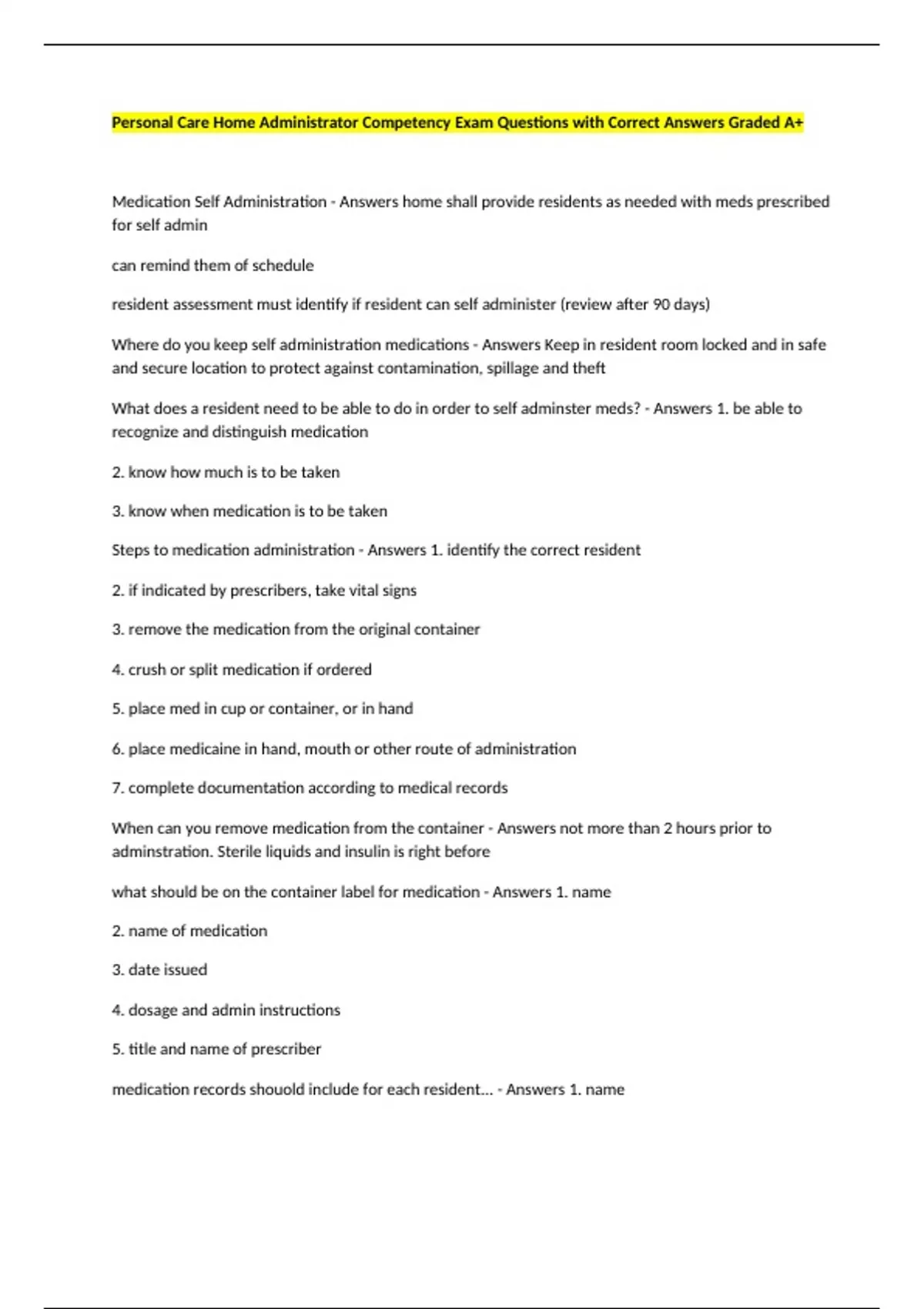 Medication Self Administration - Answers home shall provide residents as needed with meds prescribed