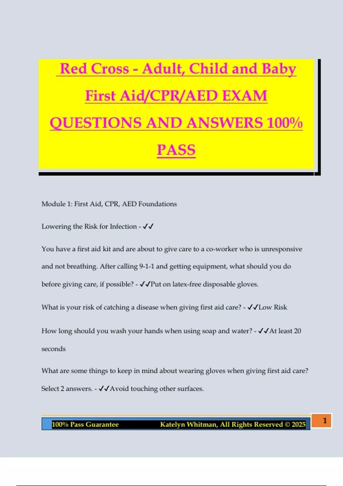 Red Cross - Adult, Child and Baby First Aid/CPR/AED EXAM QUESTIONS AND ANSWERS 100% PASS Module 1: First Aid, CPR, AED Foundations Lowering the Risk for Infection - You have a first aid kit and are about to give care to a co-worker who is unresponsive and not breathing. After calling 9-1-1 and getting equipment, what should you do before giving care, if possible? - Put on latex-free disposable gloves. What is your risk of catching a disease when giving first aid care? - Low Risk How long should you wash your hands when using soap and water? - At least 20 seconds What are some things to keep in mind about wearing gloves when giving first aid care? Select 2 answers. - Avoid touching other surfaces. 2100% Pass Guarantee Katelyn Whitman, All Rights Reserved © 2025 Wash your hands after taking off your gloves. Module 1: First Aid, CPR, AED Foundations Recognizing Emergencies and Gaining Confidence to Act - What do you see in this photo that might indicate an emergency situation? Select 2 answers. - The person appears unresponsive and is laying on the ground. The person is bleeding. The risk of infection when giving first aid care is low. Using what reduces your risk even further? Select 3 answers. - Latex-free disposable gloves Face shield Pocket mask Identify the signs that indicate an emergency exists in the video you just watched. Select 3 answers. - Paula moaned, grimaced, and rubbed her shoulder Paula made a thud when she collapsed to the ground Paula appeared unresponsive on the ground Module 1: First Aid, CPR, AED Foundations Emergency Action Steps - 3100% Pass Guarantee Katelyn Whitman, All Rights Reserved © 2025 You hear a scream and some loud noises coming from a few feet away in the crowded school playground. As you walk quickly across the playground, you tell yourself to do what first? - Check the scene for safety. A person who is responsive and breathing but not fully awake should be placed in a recovery position for which of the following reasons? - To lower their risk for choking and aspiration You are working a shift at the local farmer's market when you recognize that a 10-year- old shopping with their parent is choking. You check the scene for safety and approach the child. What do you need to do at this point? - Obtain consent from the parent (who is present) because the person is a minor. You are working in a senior center when you hear a thud and someone yells out that a man has collapsed. The scene is safe, but the man appears unresponsive. What should you do next? - Check for responsiveness by using the sho