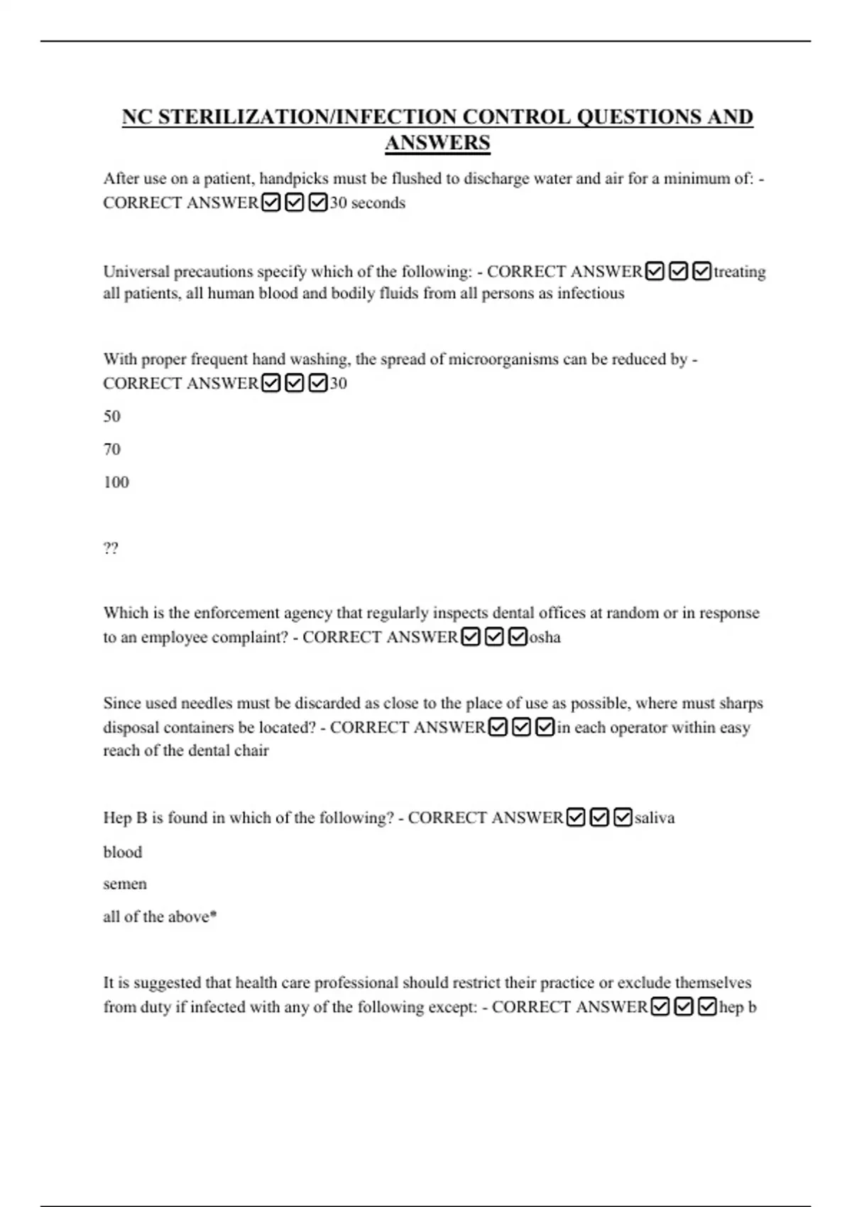 NC STERILIZATION/INFECTION CONTROL QUESTIONS AND ANSWERS After use on a patient, handpicks must be flushed to discharge water and air for a minimum of: - CORRECT ANSWER30 seconds Universal precautions specify which of the following: - CORRECT ANSWERtreating all patients, all human blood and bodily fluids from all persons as infectious