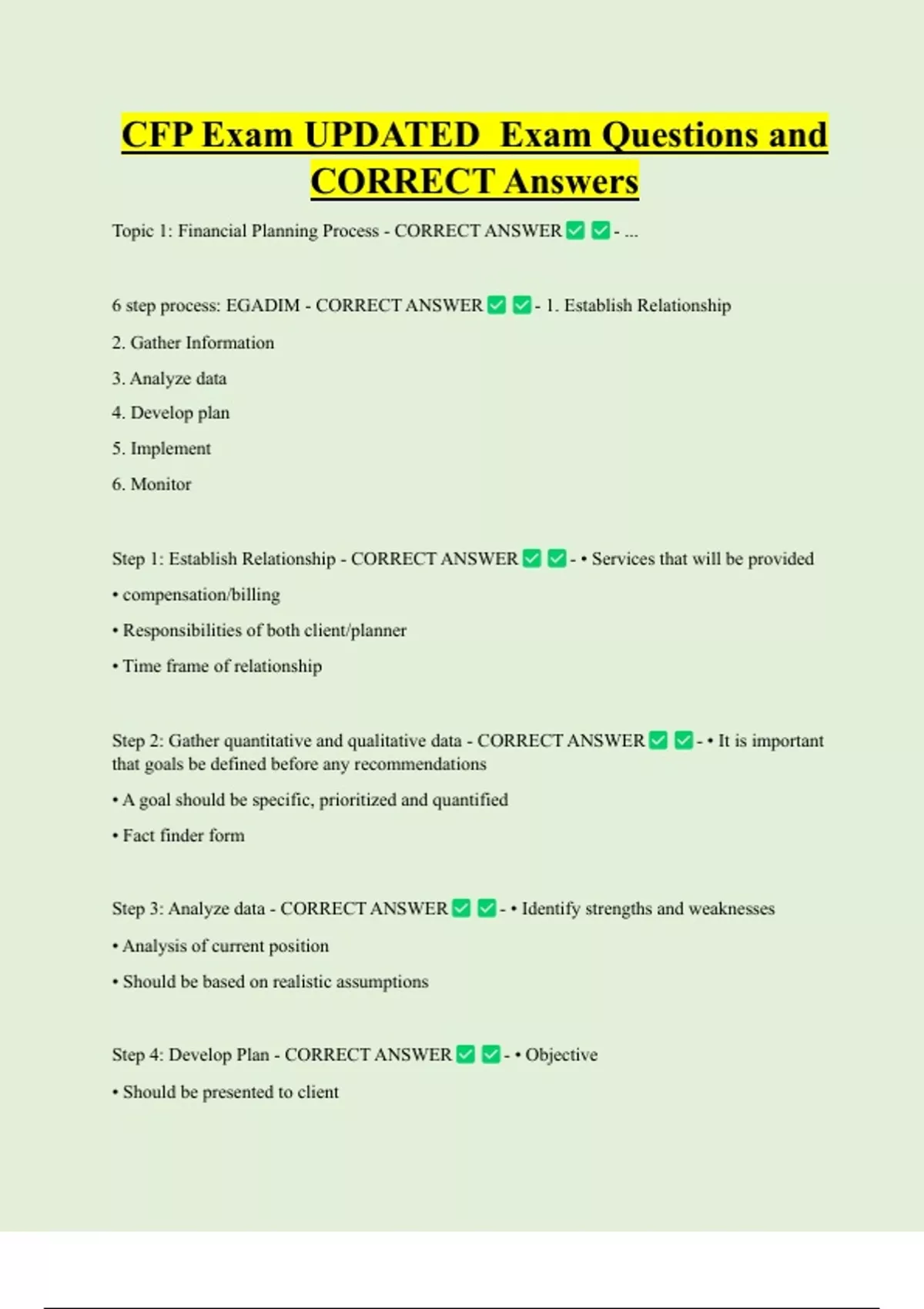 CFP Exam UPDATED Exam Questions and CORRECT Answers Topic 1: Financial Planning Process - CORRECT ANSWER 6 step process: EGADIM - CORRECT ANSWER - ... - 1. Establish Relationship 2. Gather Information 3. Analyze data 4. Develop plan 5. Implement 6. Monitor