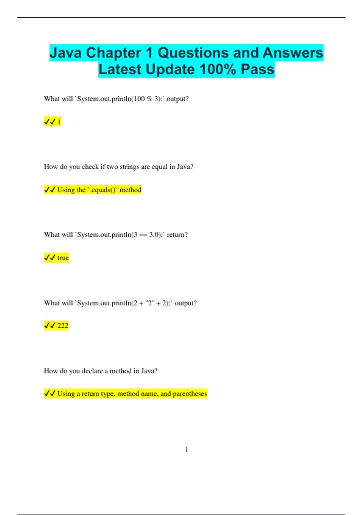 Java Chapter 1 Questions and Answers Latest Update 100% Pass What will `Sln(100 % 3);` output? 1 How do you check if two strings are equal in Java? Using the `.equals()` method What will `Sln(3 == 3.0);` return? true What will `Sln(2 + "2" + 2);` output? 222 How do you declare a method in Java? Using a return type, method name, and parentheses 2 What is the default value of a float variable in Java? 0.0f What does `Sln(1 | 2);` output? 3 Which method is used to find the length of a string? length() What will `Sln("Hello".contains("lo"));` return? true Which keyword is used to exit from a loop in Java? break What will `Sln("apple".compareTo("banana"));` return? A negative number 3 What will `Sln("Java".repeat(2));` print? JavaJava What is the output of `Sln(" ".trim().isEmpty());`? true What is the main purpose of the Java programming language? To create platform-independent applications using object-oriented principles What is the extension of a Java source code file? .java What does the `public` keyword mean in a Java class declaration? It makes the class accessible from any other class Which method serves as the entry point for a Java application? main() 4 What does `Sln("Hello, Java!");` do? It prints "Hello, Java!" to the console What is the name of the compiler used to compile Java code? javac Which component of Java translates bytecode into machine code? Java Virtual Machine (JVM) What is the default value of an int variable in Java? 0 What does `Sln(10 / 4);` output? 2 What does the `new` keyword do in Java? It creates a new object