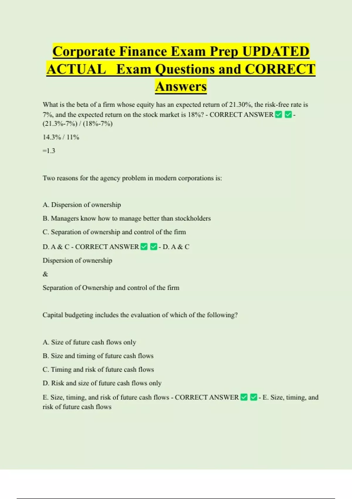 Corporate Finance Exam Prep UPDATED ACTUAL Exam Questions and CORRECT Answers What is the beta of a firm whose equity has an expected return of 21.30%, the risk-free rate is 7%, and the expected return on the stock market is 18%? - CORRECT ANSWER (21.3%-7%) / (18%-7%) 14.3% / 11% =1.3 Two reasons for the agency problem in modern corporations is: A. Dispersion of ownership B. Managers know how to manage better than stockholde
