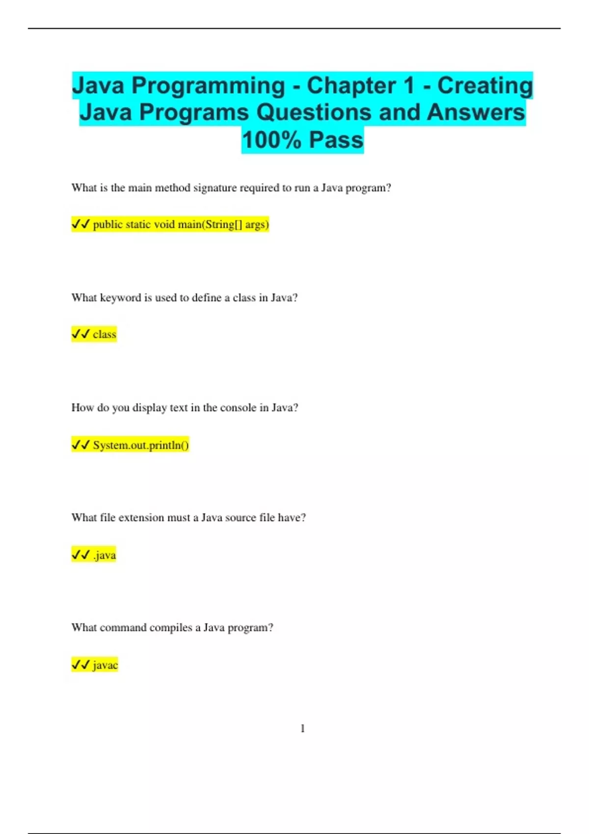 Java Programming - Chapter 1 - Creating Java Programs Questions and Answers 100% Pass What is the main method signature required to run a Java program? public static void main(String[] args) What keyword is used to define a class in Java? class How do you display text in the console in Java? Sln() What file extension must a Java source file have? .java What command compiles a Java program? javac 2 What command runs a compiled Java program? java What is the default access modifier for a class in Java if none is specified? package-private Which function is the entry point of a Java application? main() What is the purpose of comments in Java? To explain code without affecting execution What is the correct syntax for a single-line comment in Java? // This is a comment What is the correct syntax for a multi-line comment in Java? /* This is a comment */ 3 Which keyword is used to create an object in Java? new What is the default value of an uninitialized int variable in Java? 0 How do you declare a constant variable in Java? final Which function is used to get user input in Java? S() What is the keyword used to define a method in Java? void (or a specific return type) Which class is used to read input from the console? Scanner 4 How do you import a class from another package in Java? import packageNName; What is the output of Sln("Java".length());? 4 How do you declare an integer variable in Java? int x; What is the result of 10 / 3 in Java? 3 How do you perform string concatenation in Java? Using + What is the purpose of the return statement in Java? To send a value back from a method