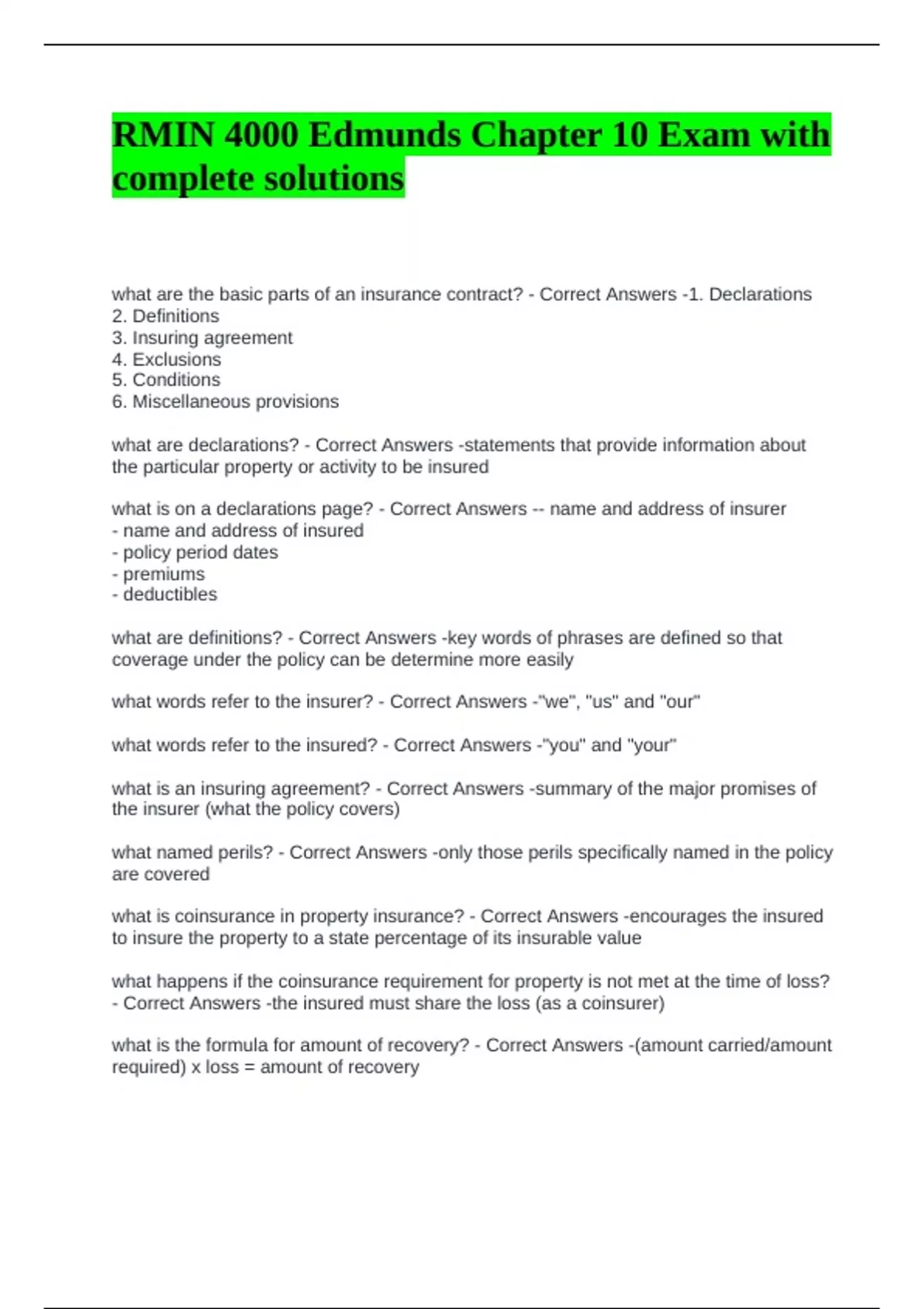 RMIN 4000 Edmunds Chapter 10 Exam with