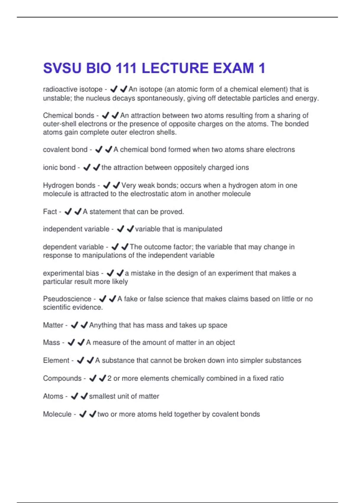radioactive isotope - ️️An isotope (an atomic form of a chemical element) that is unstable; the nucleus decays spontaneously, giving off detectable particles and energy. Chemical bonds - ️️An attraction between two atoms resulting from a sharing of outer-shell electrons or the presence of opposite charges on the atoms. The bonded atoms gain complete outer electron shells. covalent bond - ️️A chemical bond formed when two atoms share electrons ionic bond - ️️the attraction between oppositely charged ions Hydrogen bonds - ️️Very weak bonds; occurs when a hydrogen atom in one molecule is attracted to the electrostatic atom in another molecule Fact - ️️A statement that can be proved. independent variable - ️️variable that is manipulated dependent variable - ️️The outcome factor; the variable that may change in response to manipulations of the independent variable