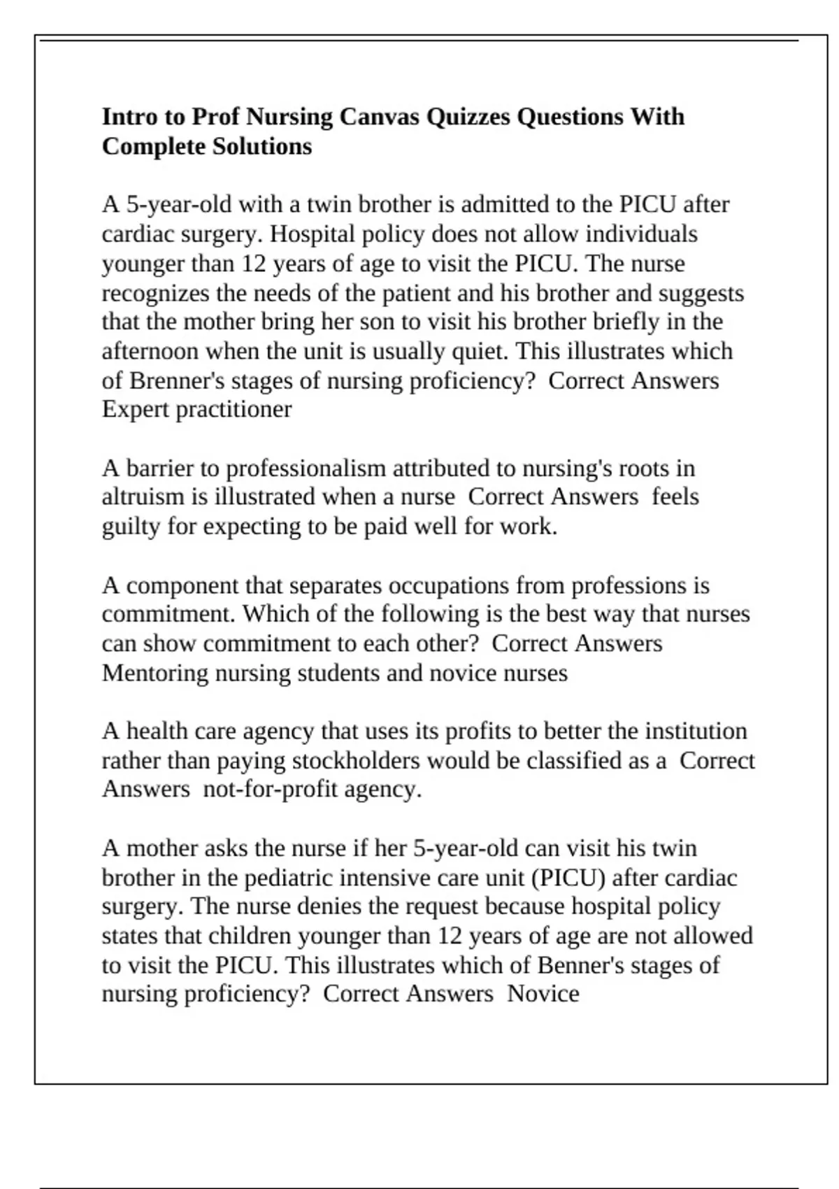 Intro to Prof Nursing Canvas Quizzes Questions With Complete Solutions