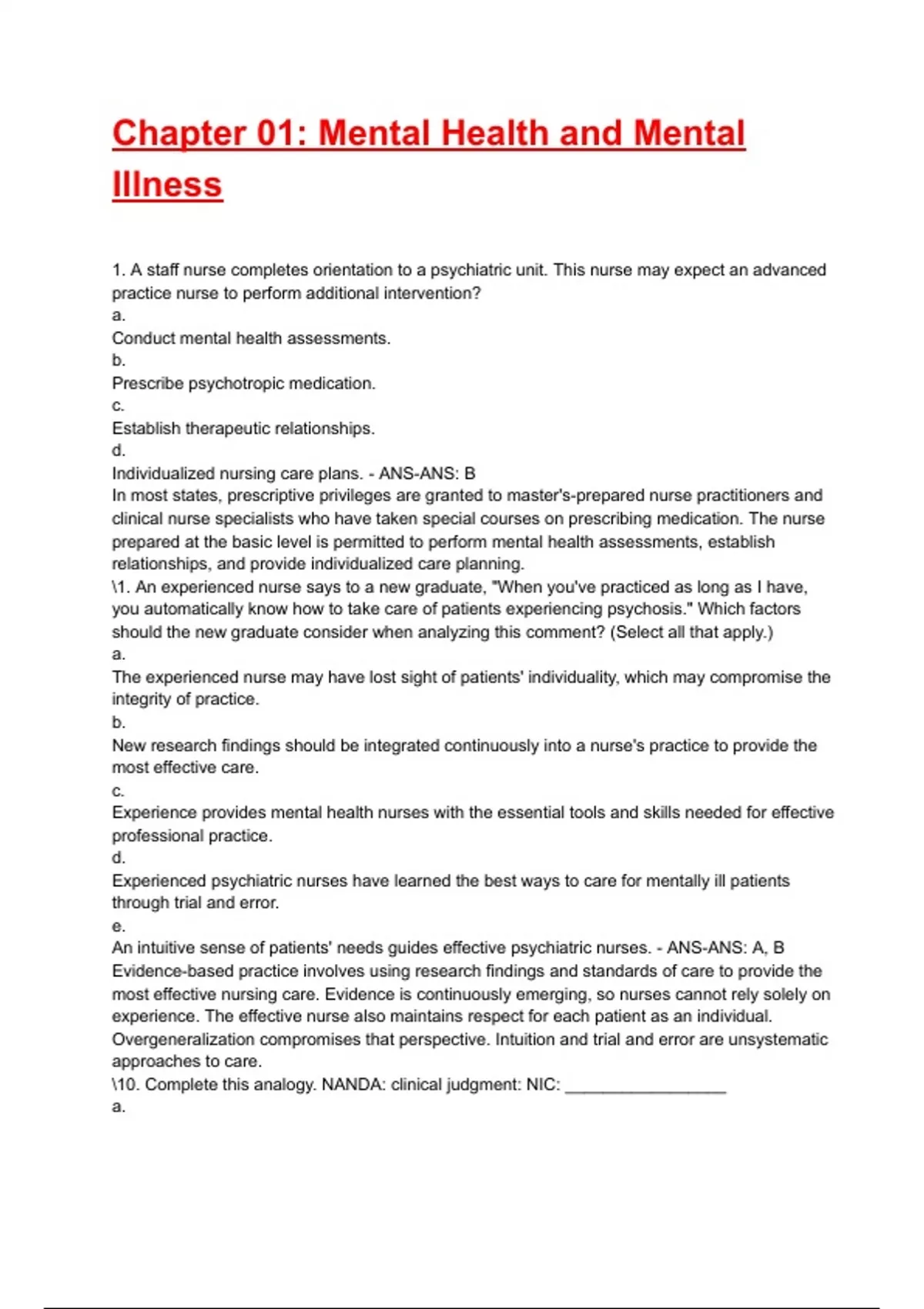 \10. Complete this analogy. NANDA: clinical judgment: NIC: _________________