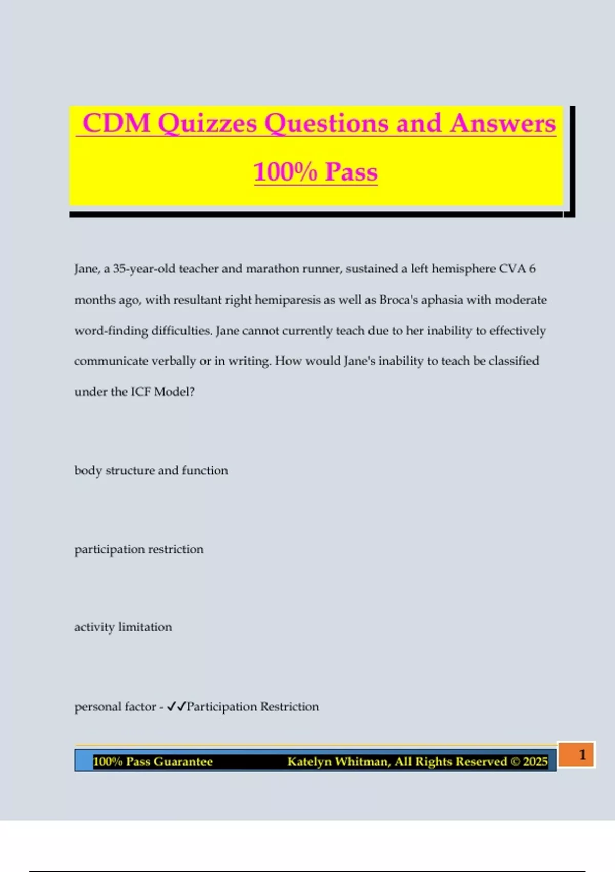 CDM Quizzes Questions and Answers 100% Pass Jane, a 35-year-old teacher and marathon runner, sustained a left hemisphere CVA 6 months ago, with resultant right hemiparesis as well as Broca's aphasia with moderate word-finding difficulties. Jane cannot currently teach due to her inability to effectively communicate verbally or in writing. How would Jane's inability to teach be classified under the ICF Model? body structure and function participation restriction activity limitation personal factor - Participation Restriction 2100% Pass Guarantee Katelyn Whitman, All Rights Reserved © 2025 According to the Nagi Model, the term disablement: emphasizes pathology and the impact on function. emphasizes factors inherent to an individual to manage function. emphasizes that function is determined by the pre-pathologic state. emphasizes that function exists on a continuum. - emphasizes pathology and the impact on function. Consider the following scenario and identify the health condition. Your patient or client is a 75-year-old female with an eight-year history of Parkinson's disease who experienced a fall that resulted in a supraspinatus tear. She reports increased pain in her shoulder that seems exacerbated by her Parkinson's disease symptoms. 3100% Pass Guarantee Katelyn Whitman, All Rights Reserved © 2025 Parkinson's disease history of a fall supraspinatus tear pain - Supraspinatus Tear Consider the following scenario and identify the activity limitation. Your patient or client is a 20-year-old female with an acute right ankle sprain that she experienced while managing her rolling luggage off a curb while wearing high-heeled shoes. She has significant swelling at the ankle and foot and a d