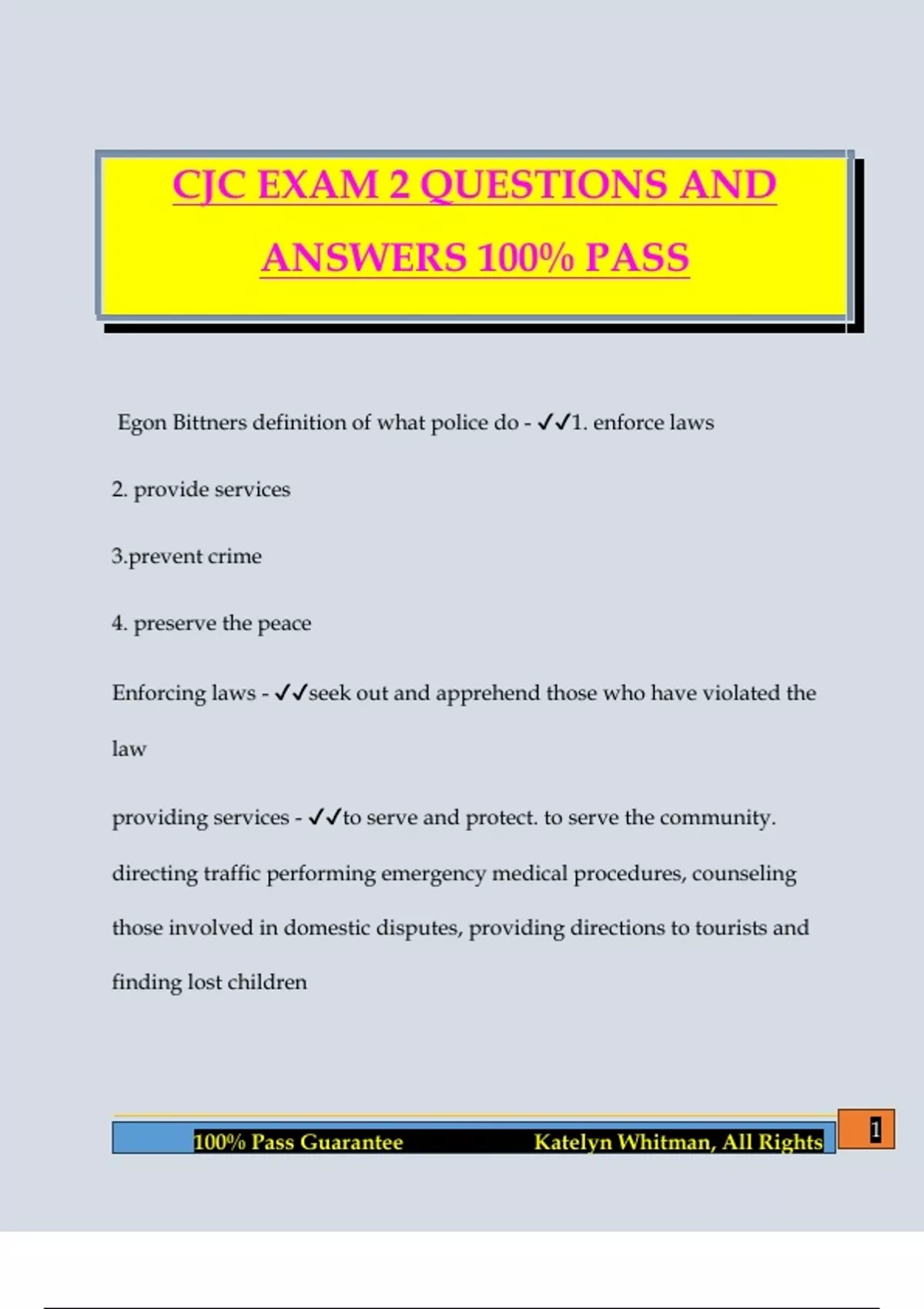 CJC EXAM 2 QUESTIONS AND ANSWERS 100% PASS Egon Bittners definition of what police do - 1. enforce laws 2. provide services nt crime 4. preserve the peace Enforcing laws - seek out and apprehend those who have violated the law providing services - to serve and protect. to serve the community. directing traffic performing emergency medical procedures, counseling those involved in domestic disputes, providing directions to tourists and finding lost children 2 100% Pass Guarantee Katelyn Whitman, All Rights Preventing crime - limited basis police can prevent crime. quickest way ti impact crime us with a well led and appropriately focused police force Preserving the peace - cops show up at a house party more likely that a crime won't occur Sir Robert "Bobbie" - pushed the metropolitan police act forming the London met police Under peels discretion, the bobbies as the police were called, did not carry any firearms and were assigned to specific areas aka beats 5 years later, working from peels model, Boston formed the first organized police department consisting of 6 full time officers Political Era 1840 to 1930 - the recruitment and promotion of police officers were intricately tied to the politics of the day patronage system- spoils system primary function: provide rands of social services to citizenry 3 100% Pass Guarantee Katelyn Whitman, All Rights Intimate with the community Patrolling on foot in neighborhoods Weakness: police brutality and corruption Reform Era - George Wickersham- focused ib two areas if the American Policing that needed to be reformed 1. police brutality 2. corrupting influence of politics Function: crime control tactics: patrolling neighborhoods in cars. rapid response to emergency calls for service weakness: riots, mistrust upon citizens Distant with community Proffessional Model - A stele of policing advocated by August Vollmer and OW Wilson that emphasized centralized police organizations 4 100% Pass Guarantee Katelyn Whitman, All Rights increased use of technology and a limitation of police discretion through regulations and guidelines Patronage system - a form of corruption in which the political party in power hires and promotes police officers, receiving job related favors Community era - based on the notion that meaningful interaction between officers and citizens will lead to a partnership in preventing and fighting crime 1980-200 Function: continue to control crime but also provid