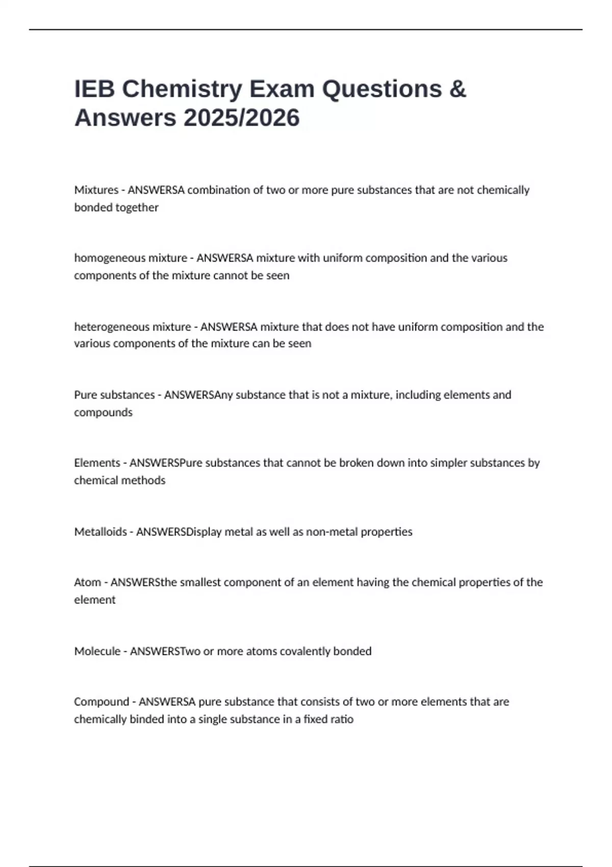 Pure substances - ANSWERSAny substance that is not a mixture, including elements and