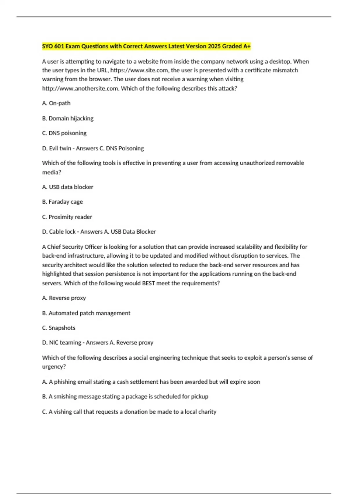 SYO 601 Exam Questions with Correct Answers Latest Version 2025 Graded A+ A user is attempting to navigate to a website from inside the company network using a desktop. When the user types in the URL, , the user is presented with a certificate mismatch warning from the browser. The user does not receive a warning when visiting . Which of the following describes this attack? A. On-path B. Domain hijacking C. DNS poisoning D. Evil twin - Answers C. DNS Poisoning Which of the following tools is effective in preventing a user from accessing unauthorized removable media? A. USB data blocker B. Faraday cage C. Proximity reader D. Cable lock - Answers A. USB Data Blocker A Chief Security Officer is looking for a solution that can provide increased scalability and flexibility for back-end infrastructure, allowing it to be updated and modified without disruption to services. The security architect would like the solution selected to reduce the back-end server resources and has highlighted that session persistence is not important for the applications running on the back-end servers. Which of the following would BEST meet the requirements? A. Reverse proxy B. Automated patch management C. Snapshots D. NIC teaming - Answers A. Reverse proxy Which of the following describes a social engineering technique that seeks to exploit a person's sense of urgency? A. A phishing email stating a cash settlement has been awarded but will expire soon B. A smishing message stating a package is scheduled for pickup C. A vishing call that requests a donation be made to a local charity D. A SPIM notification claiming to be undercover law enforcement investigating a cybercrime - Answers A. A phishing email stating a cash settlement has been awarded but will expire soon A security analyst is reviewing application logs to determine the source of a breach and locates the following log: Which of the following has been observed? A. DLL Injection B. API attack C. SQLi D. XSS - Answers C. SQLi An audit identified PII being utilized in the development environment of a critical application. The Chief Privacy Officer (CPO) is adamant that this data must be removed; however, the developers are concerned that without real data they cannot perform functionality tests and search for specific data. Which of the following should a security professional implement to BEST satisfy both the CPO's and the development team's requirements? A. Data anonymization B. Data encryption C. Data masking D. Data tokenization - Answers A company is implementing a DLP solution on the file server. The file server has PII, financial information, and health information stored on it. Depending on what type of data that is hosted on the file server, the company wants different DLP rules assigned to the data. Which of the following should the company do to help accomplish this goal? A. Classify the data. B. Mask the data. C. Assign the application owner. D. Perform a risk analysis. - Answers A forensics investigator is examining a number of unauthorized payments that were reported on the company's website. Some unusual log entries show users received an email for an unwanted mailing list and clicked on a link to attempt to unsubscribe. One of the users reported the email to the phishing team, and the forwarded email revealed the link to be: <a href=" Which of the following will the forensics investigator MOST likely determine has occurred? A. SQL injection B. Broken authentication C. XSS D. XSRF - Answers A report delivered to the Chief Information Security Officer (CISO) shows that some user credentials could be exfiltrated. The report also indicates that users tend to choose the same credentials on different systems and applications. Which of the following policies should the CISO use to prevent someone from using the exfiltrated credentials? A. MFA B. Lockout