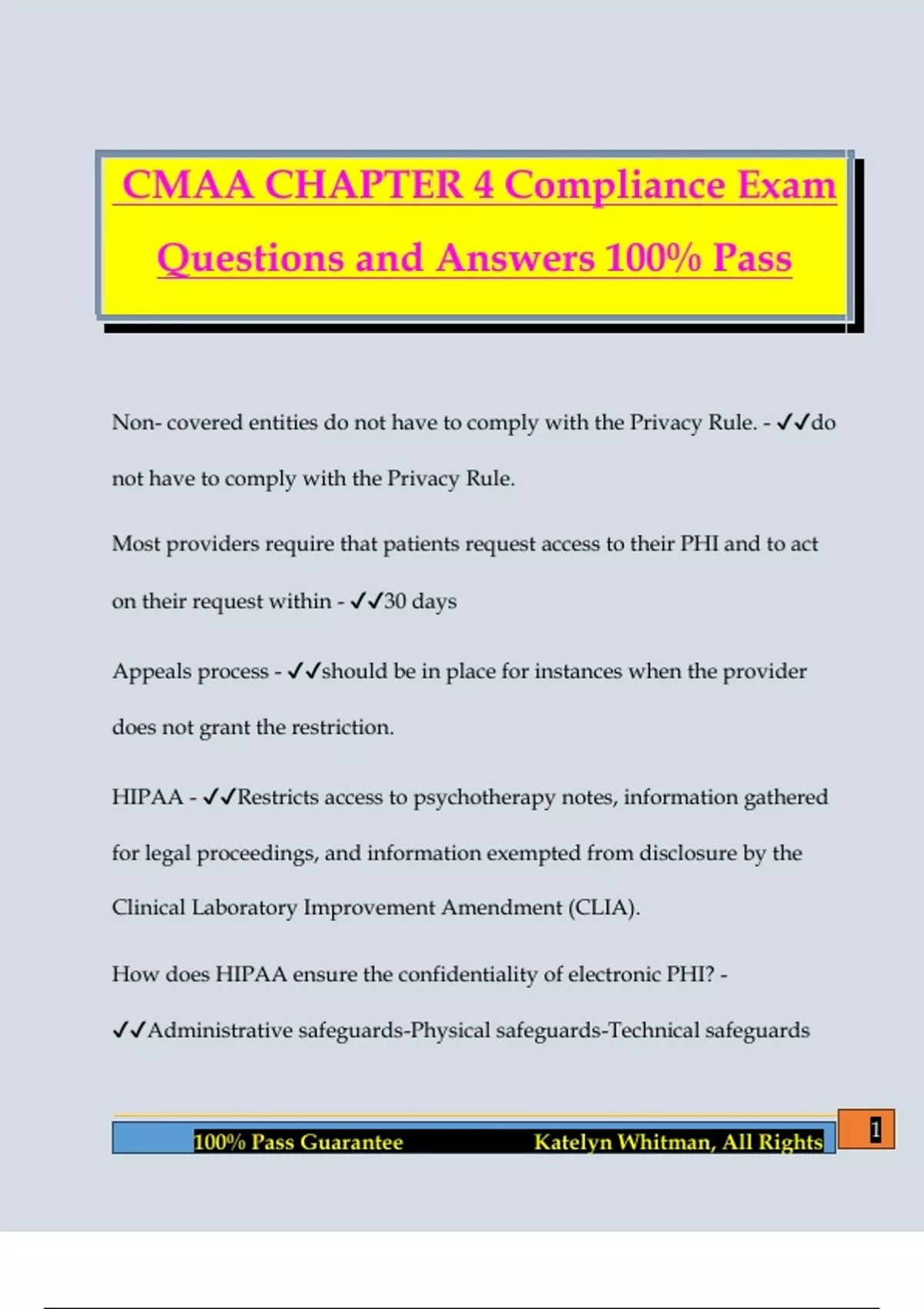 CMAA CHAPTER 4 Compliance Exam Questions and Answers 100% Pass Non- covered entities do not have to comply with the Privacy Rule. - do not have to comply with the Privacy Rule. Most providers require that patients request access to their PHI and to act on their request within - 30 days Appeals process - should be in place for instances when the provider does not grant the restriction. HIPAA - Restricts access to psychotherapy notes, information gathered for legal proceedings, and information exempted from disclosure by the Clinical Laboratory Improvement Amendment (CLIA). How does HIPAA ensure the confidentiality of electronic PHI? - Administrative safeguards-Physical safeguards-Technical safeguards 2 100% Pass Guarantee Katelyn Whitman, All Rights Audit trail - A report that traces who has accessed electronic information OSHA form 300A - Which OSHA form is a summary of work-related injuries and illnesses? Exposure control plan - A plan that describes tasks employees must perform if there is a risk for exposure to blood or other potentially infectious materials, and what procedures are in place to track employee exposure OSHA form 301 - If required, what form should be used to report an incident to OSHA? Administrative Simplification Compliance Act (ASCA) - requires claims to Medicare be transmitted electronically. Medigap - A private health insurance that pays for most of the charges that's not covered by Parts A and B. 3 100% Pass Guarantee Katelyn Whitman, All Rights Why is Block 11 important? - To indicate that a good faith effort has been made to determine which is the primary insurance and which is secondary What is OSHAs mission? - To ensure a healthy working environment The Health Insurance Portability and Accountability Act was enacted in what year? - 1996 All healthcare facilities insurance companies and all covered entities had to be in compliance by what date? - April 14, 2003 Non-covered entities - Organizations that use, collect, access, and disclose individually identifiable health information, but do not transmit electronic data. These do not have to comply with the Privacy Rule. According to the Privacy Rule - Covered entities are allowed to share information relevant to the patient's care with a spouse, family members, friends, or other individuals identified by the patient. Covered entities 4 100% Pass Guarantee Katelyn Whitman, All Rights Professional judgement - The _________ __________ are allowed to share relevant information if it can reasonably be inferred, based on ________ ________ that the patient does not object or that 1. the action is in the patient's best interest. If a patient is a child, parents are allowed to see the medical records as long as this practice is - consistent with state law. When a patient signs a privacy practice document what does the medical office proceed by doing? - Release information to all covered entities. Non-covered entities do not comply with - .Privacy Rule Security standards are divided into the following 3 categories