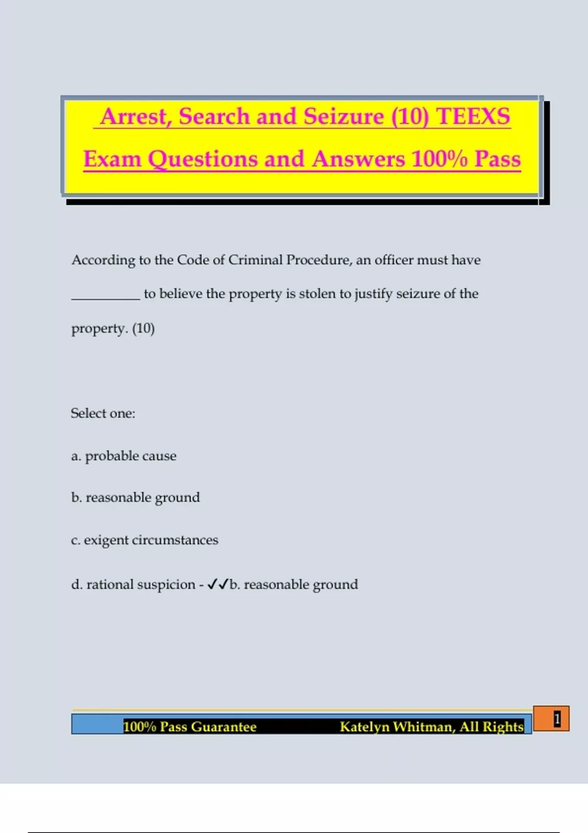 Arrest, Search and Seizure (10) TEEXS Exam Questions and Answers 100% Pass