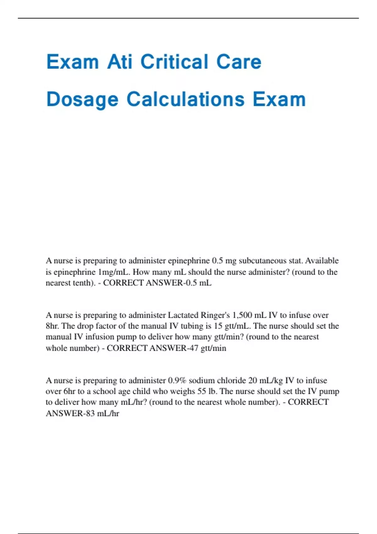 Exam Ati Critical Care Dosage Calculations Exam A nurse is preparing to administer epinephrine 0.5 mg subcutaneous stat. Available is epinephrine 1mg/mL. How many mL should the nurse administer? (round to the nearest tenth). - CORRECT ANSWER-0.5 mL A nurse is preparing to administer Lactated Ringer's 1,500 mL IV to infuse over 8hr. The drop factor of the manual IV tubing is 15 gtt/mL. The nurse should set the manual IV infusion pump to deliver how many gtt/min? (round to the nearest whole number) - CORRECT ANSWER-47 gtt/min A nurse is preparing to administer 0.9% sodium chloride 20 mL/kg IV to infuse over 6hr to a school age child who weighs 55 lb. The nurse should set the IV pump to deliver how many mL/hr? (round to the nearest whole number). - CORRECT ANSWER-83 mL/hr