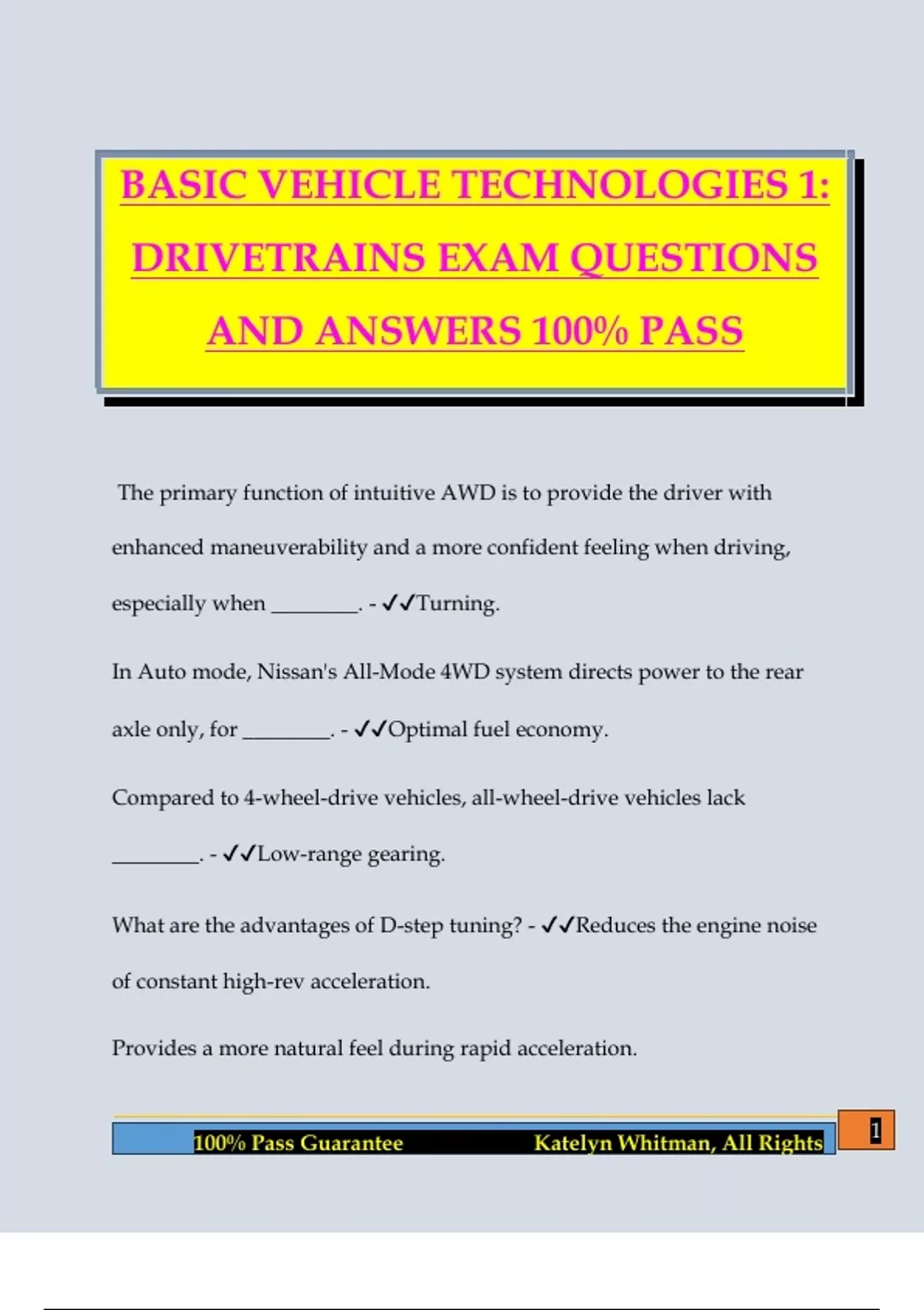 BASIC VEHICLE TECHNOLOGIES 1: DRIVETRAINS EXAM QUESTIONS AND ANSWERS 100% PASS The primary function of intuitive AWD is to provide the driver with enhanced maneuverability and a more confident feeling when driving, especially when ________. - Turning. In Auto mode, Nissan's All-Mode 4WD system directs power to the rear axle only, for ________. - Optimal fuel economy. Compared to 4-wheel-drive vehicles, all-wheel-drive vehicles lack ________. - Low-range gearing. What are the advantages of D-step tuning? - Reduces the engine noise of constant high-rev acceleration. Provides a more natural feel during rapid acceleration. 2 100% Pass Guarantee Katelyn Whitman, All Rights With Nissan's shift-on-the-fly 4WD, the driver may shift between 2-wheel drive and 4-wheel-drive high range when the vehicle is traveling at speeds of up to _____ mph. - 60 Rear-wheel drive is the preferred configuration for what vehicles? - Performance vehicles Trucks and utility vehicles. How does the Xtronic CVT (Continuously Variable Transmission) vary its gear ratios? - Simultaneously adjusts the diameter of the drive pulley and the driven pulley. Unlike conventional AWD systems, Nissan's intuitive AWD incorporates input from ________. - The steering angle sensor The yaw rate/lateral g-sensor. In Auto mode, how does Nissan's All-Mode 4WD system react when it senses changes in surface conditions? - Varies the distribution of power between front and rear axles to provide additional traction. 3 100% Pass Guarantee Katelyn Whitman, All Rights Varies the distribution of power between front and rear axles to provide additional traction - A single unit combining the clutch, gearbox, and differential gears between the front wheels. What are the advantages of an electronically controlled transmission? - Smooth, efficient shifting Increased service life. What is the advantage of Active Brake Limited Slip? - Applies individual braking force to any wheel that has lost traction. What does Downshift Rev Matching do for an automatic transmission? - Provides smoother downshifts and a sportier sound and feel. How does D-step tuning affect CVT operation? - Simulates shifts in certain driving situations
