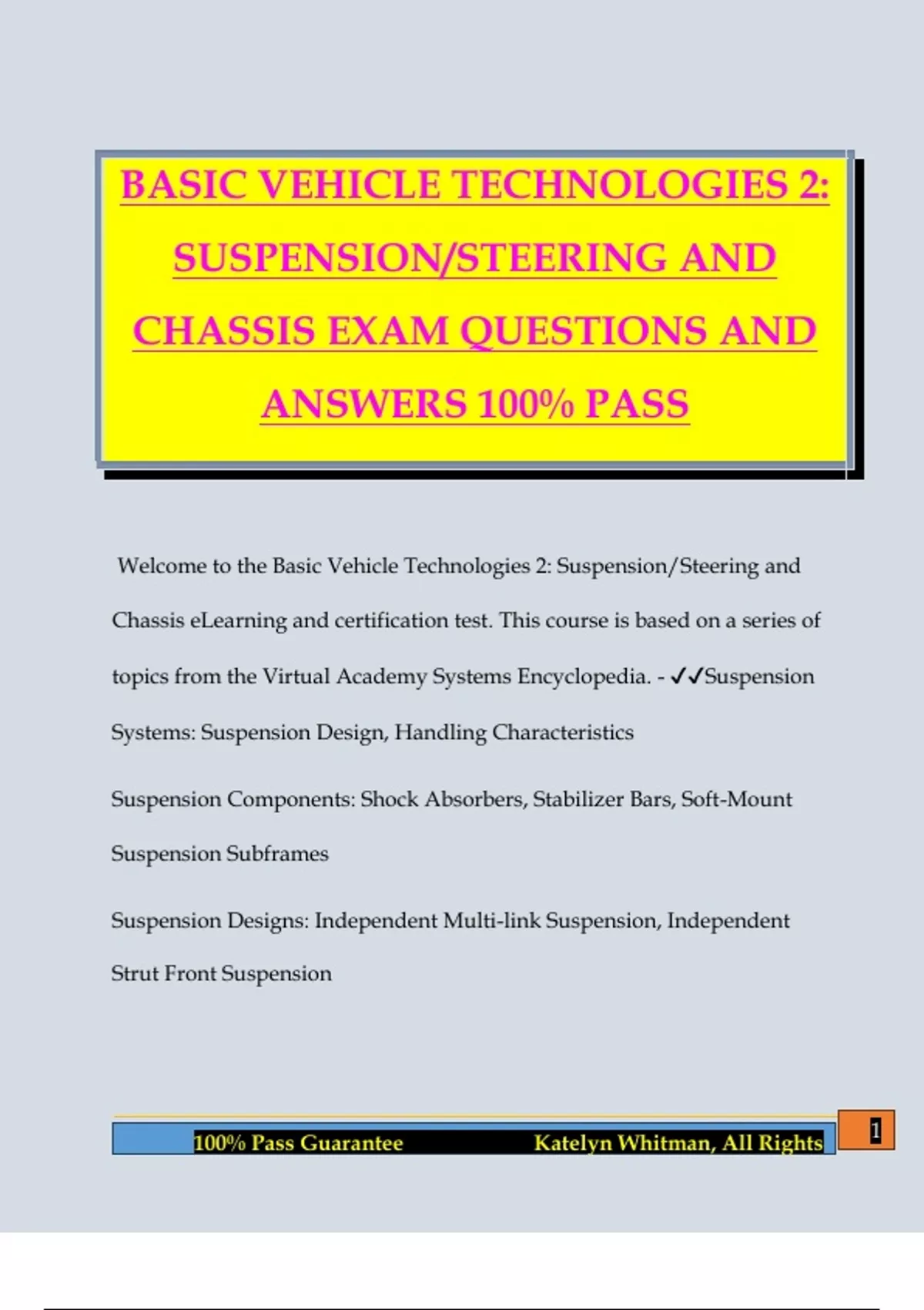 BASIC VEHICLE TECHNOLOGIES 2: SUSPENSION/STEERING AND CHASSIS EXAM QUESTIONS AND ANSWERS 100% PASS Welcome to the Basic Vehicle Technologies 2: Suspension/Steering and Chassis eLearning and certification test. This course is based on a series of topics from the Virtual Academy Systems Encyclopedia. - Suspension Systems: Suspension Design, Handling Characteristics Suspension Components: Shock Absorbers, Stabilizer Bars, Soft-Mount Suspension Subframes Suspension Designs: Independent Multi-link Suspension, Independent Strut Front Suspension 2 100% Pass Guarantee Katelyn Whitman, All Rights Steering Systems: Power Steering, Rack-and-Pinion Steering, Electrically Driven Hydraulic Power Steering, Electric Power-assisted Steering Advanced Handling Technologies: Active Understeer Control, Active Trace Control, Active Ride Control Chassis Design: Chassis Philosophy, Structural Rigidity; Noise, Vibration, and Harshness; Front Midship (FM) Platform Body Construction: Unibody Construction, Body-on-Frame Construction, Utili-track System What's the purpose of benchmarking in the vehicle manufacturing process? - 1. Identify competitive strengths and weaknesses of competitive vehicles. 2. Manufacturers set standards by which they will jud