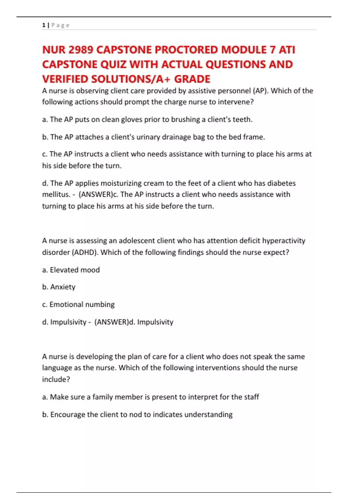 NUR 2989 CAPSTONE PROCTORED MODULE 7 ATI CAPSTONE QUIZ WITH ACTUAL QUESTIONS AND VERIFIED SOLUTIONS/A+ GRADE