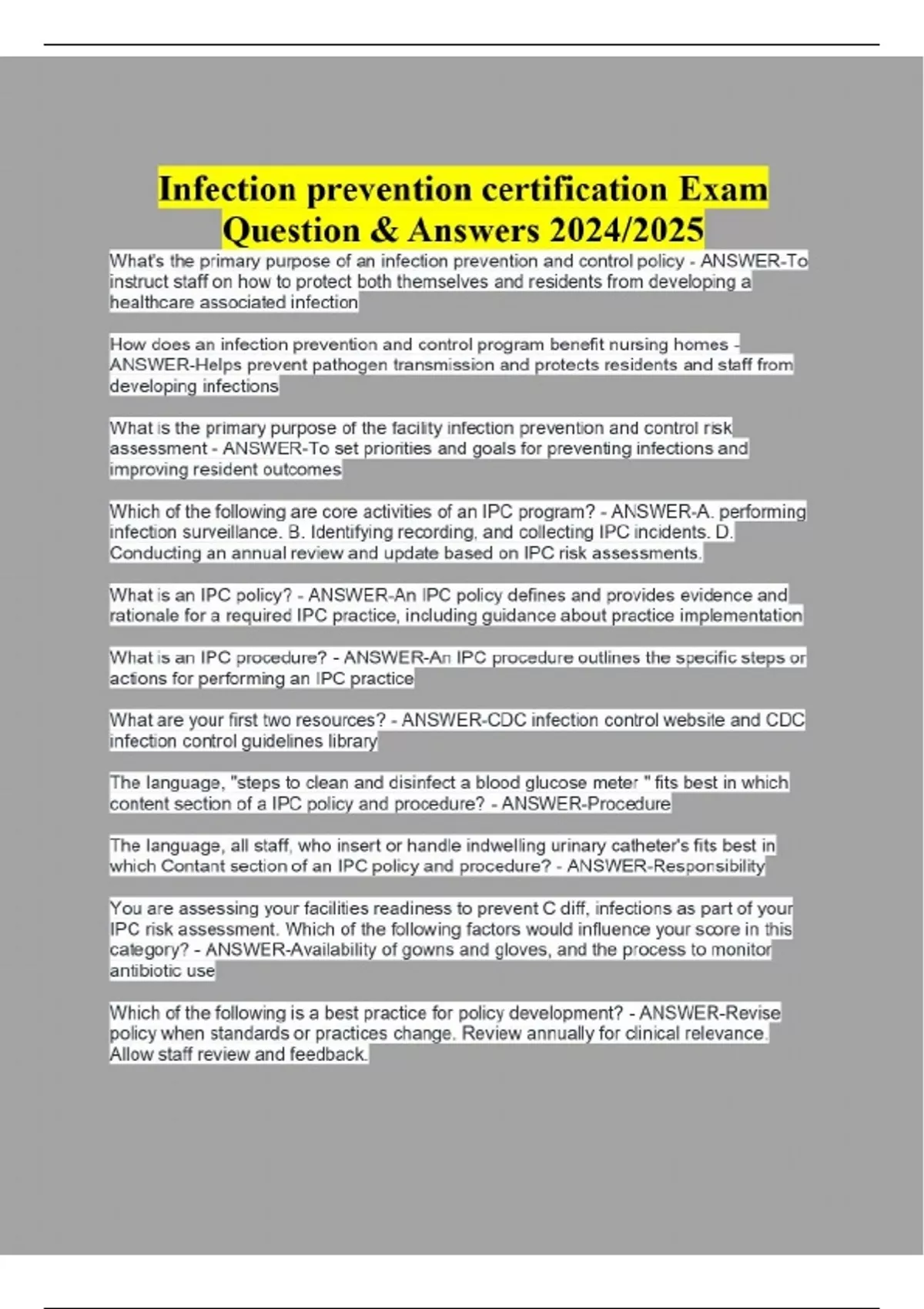 Infection prevention certification Exam Question & Answers 2024/2025 What's the primary purpose of an infection prevention and control policy - ANSWER-To instruct staff on how to protect both themselves and residents from developing a healthcare associated infection How does an infection prevention and control program benefit nursing homes - ANSWER-Helps prevent pathogen transmission and protects residents and staff from developing infections What is the primary purpose of the facility infection prevention and control risk assessment - ANSWER-To set priorities and goals for preventing infections and improving resident outcomes Which of the following are core activities of an IPC program? - ANSWER-A. performing infection surveillance. B. Identifying recording, and collecting IPC incidents. D. Conducting an annual review and update based on IPC risk assessments. What is an IPC policy? - ANSWER-An IPC policy defines and provides evidence and rationale for a required IPC practice, including guidance about practice implementation What is an IPC procedure? - ANSWER-An IPC procedure outlines the specific steps or actions for performing an IPC practice What are your first two resources? - ANSWER-CDC infection control website and CDC infection control guidelines library The language, "steps to clean and disinfect a blood glucose meter " fits best in which content section of a IPC policy and procedure? - ANSWER-Procedure The language, all staff, who insert or handle indwelling urinary catheter's fits best in which Contant section of an IPC policy and procedure? - ANSWER-Responsibility You are assessing your facilities readiness to prevent C diff, infections as part of your IPC risk assessment. Which of the following factors would influence your score in this category? - ANSWER-Availability of gowns and gloves, and the process to monitor antibiotic use Which of the following is a best practice for policy development? - ANSWER-Revise policy when standards or practices change. Review annually for clinical relevance. Allow staff review and feedback. The risk for developing an infection, or transmitting pathogens are based on which of the following - ANSWER-Adhering to IPC policies and procedures. Population served. Care and service provided. Infections that are occurring in the community. Which of the following are considerations when scoring the risk of an infection event on the IPC risk assessment - ANSWER-Probability of occurrence. Level of harm. Readiness to prevent. Which of the following are reasons for conducting an annual IPC risk assessment in nursing homes - ANSWER-Assessing potential infection risks to prevent resident harm. Prioritizing area of focus for IPC program. Allocating resources to support IPC performance improvement activities. After you have scored the risk assessment which of the following actions, would you take first to address the findings - ANSWER-Identify high scoring items for IPC program prioritization Which of the following best describes the primary role of the infection prevention is in a nursing home - ANSWER-Leading the infection, prevention and control program True or false individual or individuals designated as a nursing homes infection preventionist may work at a corporate location and handle all infection prevention and control responsibilities remotely - ANSWER-False Which of the following are considered important skills of an effective infection prevention list - ANSWER-Critical thinking. Data interpretation. Communication. All of the above. All of the above. Epidemiology - ANSWER-is the study of the distribution and determinants of health-related states or events in specified populations an application of this knowledge to the control of health problems Surveillance - ANSWER-is the ongoing systematic collection, analysis, interpretation, and dissemination of data. It is conduct into identify infections in monitor performance of ABC practices to reduce infection risk and prevent spread of pathogens in my residence staff and visitors. Common infectious diseases - ANSWER-Infections occur because a pathogen such as a bacteria, virus or fungus is able to invade a susceptible host in cause clinical disease Pathogen transmission - ANSWER-The transmission of infectious agents or pathogens within a nursing home, requires three elements, a source or reservoir of infectious agents with a portal of exit for the agent, susceptible host with a portal of entry, receptive to the agent, and a motor transmission for the infectious agent Diagnosis of infectious disease - ANSWER-Culture-based diagnostic tests. Nucleic acid amplification, diagnostic tests, (NAAT) polymerase chain reaction tests. (PCR) Antimicrobials - ANSWER-Are drugs used to treat infections Which of the following is not a consideration when interpreting diagnostic test results? - ANSWER-Cost of the diagnostic test Five skills needed to effectively perform as an IP - ANSWER-Communicator, Leader, educator, critical thinker, and data, interpreter, and collaborator Which role is an IP showing when he or she adapts information to address different backgrounds and learning needs - ANSWER-Educator Which role is an IP demonstrating when he or she advocates for IPC program - ANSWER-A liter Which of the following are true statements about the QIN-QIO program? - ANSWER-Provides consultation services to nursing homes at no cost. Works with nursing homes on variety of IPC program projects. Continues...