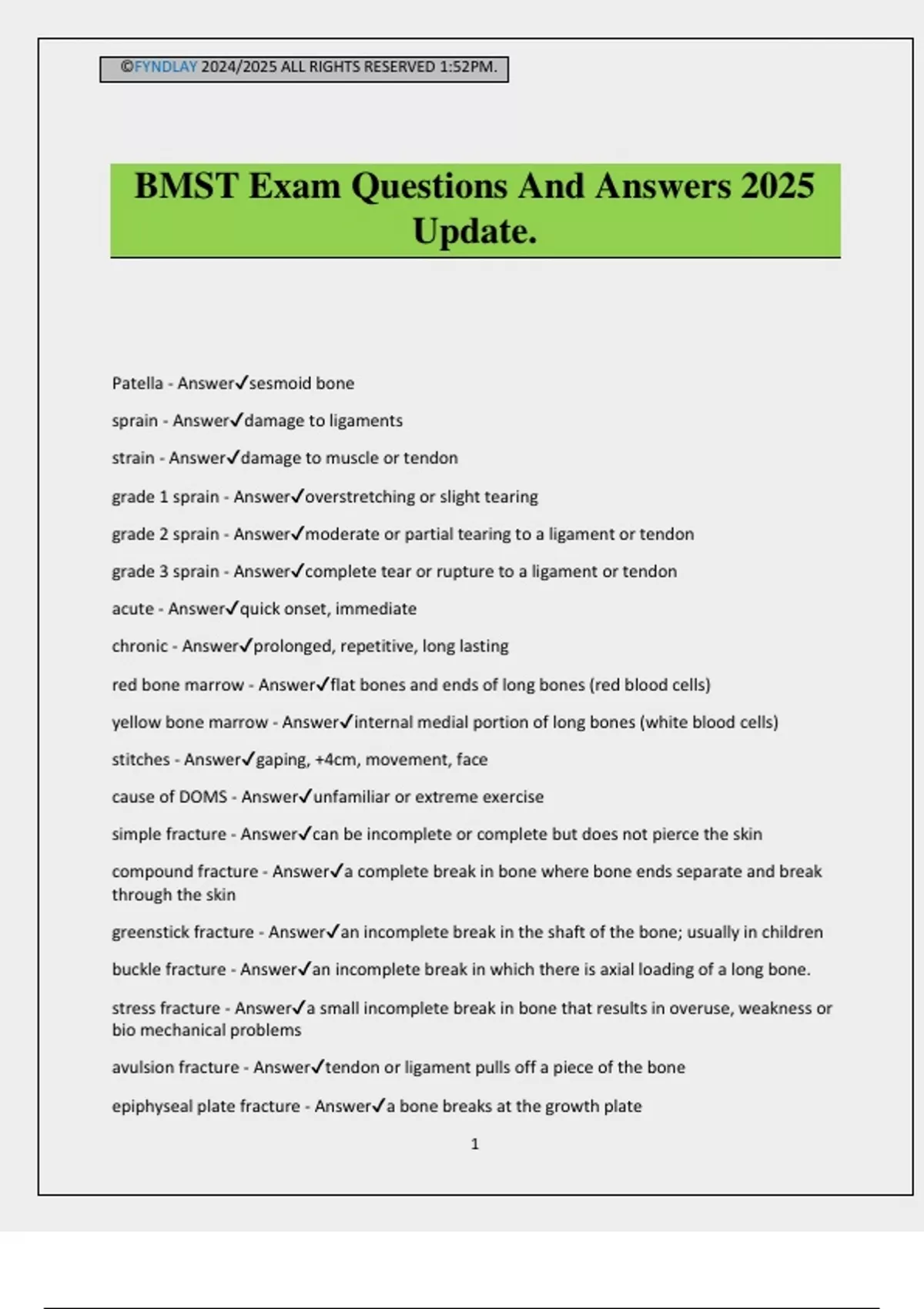 ©FYNDLAY 2024/2025 ALL RIGHTS RESERVED 1:52PM. 1 BMST Exam Questions And Answers 2025 Update. Patella - Answersesmoid bone sprain - Answerdamage to ligaments strain - Answerdamage to muscle or tendon grade 1 sprain - Answeroverstretching or slight tearing grade 2 sprain - Answermoderate or partial tearing to a ligament or tendon grade 3 sprain - Answercomplete tear or rupture to a ligament or tendon acute - Answerquick onset, immediate chronic - Answerprolonged, repetitive, long lasting red bone marrow - Answerflat bones and ends of long bones (red blood cells) yellow bone marrow - Answerinternal medial portion of long bones (white blood cells) stitches - Answergaping, +4cm, movement, face cause of DOMS - Answerunfamiliar or extreme exercise simple fracture - Answercan be incomplete or complete but does not pierce the skin compound fracture - Answera complete break in bone where bone ends separate and break through the skin greenstick fracture - Answeran incomplete break in the shaft of the bone; usually in children buckle fracture - Answeran