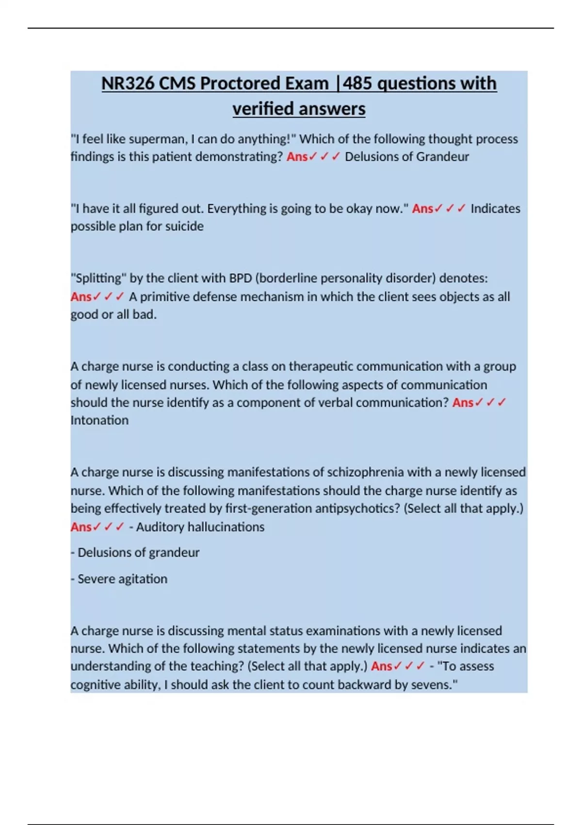 findings is this patient demonstrating? Ans✓✓✓ Delusions of Grandeur