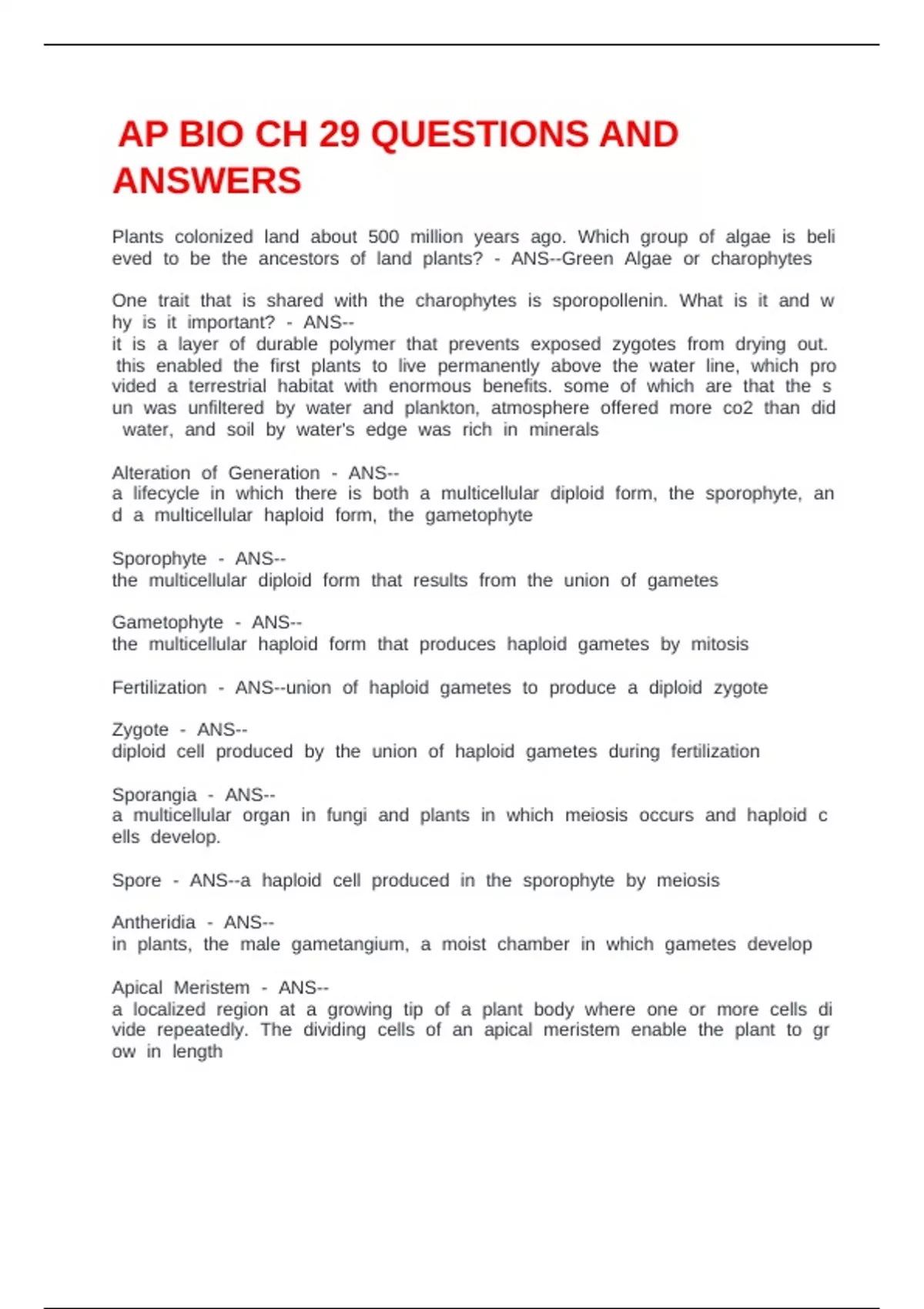 Archaeplastida - ANS--A monophyletic group that descended from an ancient protist that engulfed a cyanobacterium. Includes red algae, green algae, and land plants. Phycoerythrin - ANS--Pigment that masks the green of chlorophyll. This pigment allows red algae to absorb blue and green light (allowing them to live in deep water). Red Algae Rhodophytes - ANS--Usually multicellular. No flagellated gametes, they depend on currents for fertilization. Cell walls of corraline algae are hardened by calcium carbonate. Porphyra - ANS--A foliose red algae eaten as nori and used in fish pellets. Green Algae - ANS--Named for grass-green chloroplasts. Include chlorophytes and charophytes. Chlorophytes - ANS--Unicellular, colonial, or multicellular. Include euglena and chlamydomonas. Mostly freshwater but also marine and terrestrial. Chlamydomonas nivalis - watermelon snow - has carotenoid pigment as well as chlorophyll. Cytoplasm - ANS--Cyto means cell. Plasm means mold. Chlorophyll - ANS--Chloros means green. Phyllon means leaf. 3 Mechanisms of Chlorophyte Evolution - ANS--1. Forming colonies or filamentous masses. 2. Forming multicellular bodies by cell division and differentiation. 3. Repeated division of nuclei without cytoplasmic division. Forming colonies or filamentous masses - ANS--Wall composed of thousands of biflagellated cells embedded in gelatinous matrix. Cells connected by cytoplasm. Example: volvox - seen in stringy masses of pond scum. Forming multicellular bodies by cell division and differentiation - ANS--Thallus, blades, holdfast. Example: ulva or sea lettuce. Repeated division of nuclei without cytoplasmic division - ANS--Branched filaments are multinucleate. Thallus is one huge supercell. Similarities between green algae and land plants - ANS--1. Multicellularity. 2. Eukaryotic. 3. Photosynthetic autotrophs. 4. Cellulose cell walls. 5. Chloroplasts with chlorophylls A or B. Charophytes - ANS--Shallow, freshwater dwelling, branched, multicellular green algae. Can extend above water surface. Known as muskgrass or skunk weed because of odor. Sperm in antheridium; egg in oogonium. Similarities between charophytes and land plants - ANS--1. Rings of cellulose-synthesizing proteins in plasma membrane. 2. Peroxisomal enzymes that minimize loss of organic products. 3. Similar structure of flagellated sperm. 4. Formation of phragmoplast. 5. Presence of sporopollenin-like polymer. 6. Similar nuclear and chloroplast gene sequences. Phragmoplast - ANS--A group of microtubules that give rise to cell plate then new cell wall between daughter cells. Phragmo means fenced; plast means formed. Sporopollenin - ANS--Prevents exposed zygotes from desiccation. A major component of the cell walls of spores and pollen of many plants. Advantages of land life - ANS--More sunlight, carbon dioxide, and nutrients. Fewer herbivores and parasites, especially 425 million years ago. Disadvantages of land life - ANS--Scarcity of water. Desiccation. Gravity and lack of structural support. Differences between charophytes and land plants - ANS--1. Alternation of generations. 2. Multicellular, dependent embryos. 3. Walled spores produced in sporangia. 4. Multicellular gametangia. 5. Apical meristems. Alternation of generations in land plants - ANS--1. Gametophyte produces haploid gametes by mitosis. 2. Two gametes unite - fertilization - and form a diploid zygote. 3. Zygote develops into multicellular diploid sporophyte. 4. Sporophyte produces unicellular haploid spores by meiosis. 5. Spores develop into multicellular haploid gametophytes. Gametangia - ANS--Multicellular organs where gametes produced. Female: archegonia. Male: antheridia. Sporangia - ANS--Multicellular organisms where sporophyte produces spores. Diploid sporocytes generate haploid spores through meiosis. Apical Meristems - ANS--Localized regions of cell division at tips of roots and shoots. This sustains continues growth and allows cells to differentiate into various tissues and organs. Cuticle - ANS--Made of wax and other polymers. Covers epidermis and prevents desiccation and provides resistance to microbial attack. Fungi-Plant Interaction - ANS--420 mya first fossils of mycorrhizae and plant interaction. Allowed plants to absorb nutrients and water from soil before root systems. Plant timeline - ANS--475 mya: first fossilized land plants with spores grouped together. 425 mya: first vascular plants. 305 mya: first seeded plants. Seed - ANS--An embryo and nutrients surrounded by a protective coat. Bryophytes - ANS--First land plants. Nonvascular including: Liverworts - Hepatophyta. Mosses - Bryophyta. Hornworts - Anthocerophyta. Bryophyte Life Cycle - ANS--1. Spores develop into threadlike protonemata. 2. Haploid protonemata produce buds that divide by mitosis and grow into gametophores - male and female gametophytes. 3. Sperm from antheridia swims through film of moisture to reach egg in archegonia. 4. Zygote develops into sporophyte embryo. 5. Sporophyte grows a long stalk - seta - that emerges from archegonium. 6. Attached by its foot, the diploid sporophyte remains nutritionally dependent on the gametophyte. 7. Meiosis occurs and haploid spores develop in capsule and are then released. Nonvascular gametophyte morphology - ANS--Height constrained by lack of vascular tissue. Forms ground-hugging carpet with rhizoids anchoring it to substrate. Nonvascular sporophyte morphology - ANS--Grow from archegonia and consist of foot, seta, sporangium (capsule). Peristome discharges spores. Moss Importance - ANS--Peat moss covers 3% of earth's surface and contains 30% soil CO2. Overharvesting could greatly contribute to global warming. Seedless vascular plants - ANS--Flagellated sperm, restricted to moist environments, have no roots. Competition for space and light drove their evolution. Branching opened the way for more complex body parts. First vascular plants were only 15cm tall. Include Lycophytes and Pterophytes. Lycophytes - ANS--Seedless vascular plant 