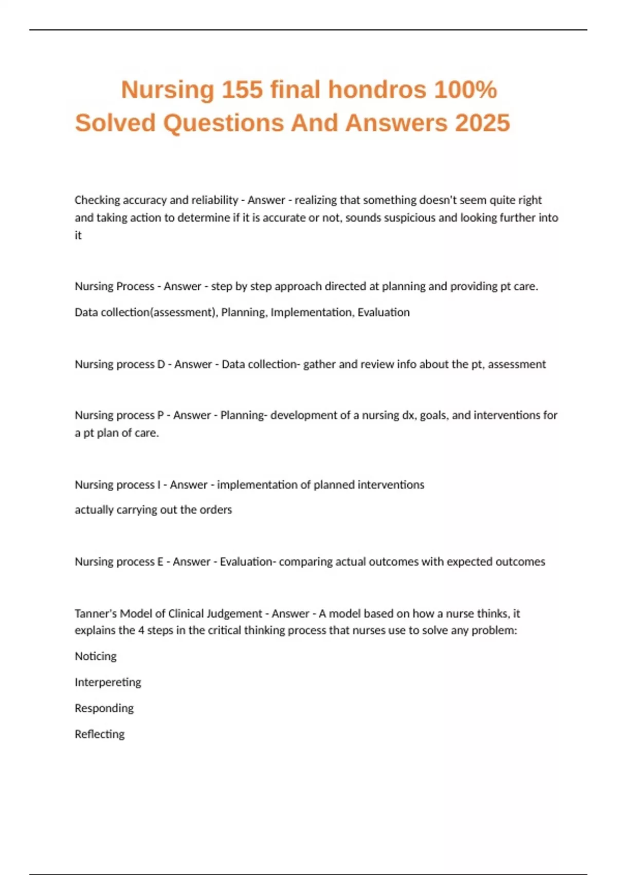 Tanner's Model of Clinical Judgement - Answer - A model based on how a nurse thinks, it