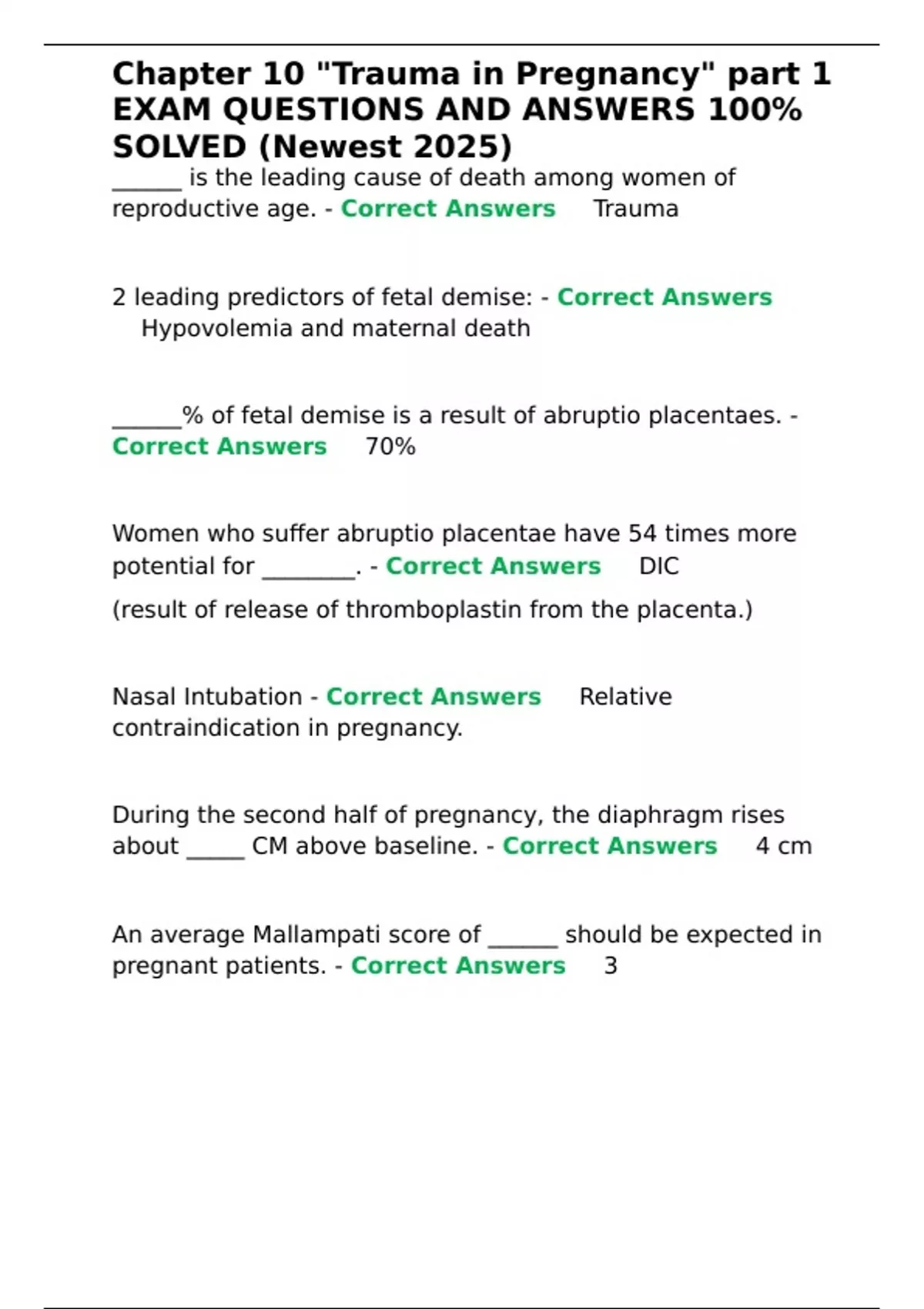 Chapter 10 Trauma in Pregnancy part 1 EXAM QUESTIONS AND ANSWERS 100- SOLVED (Newest