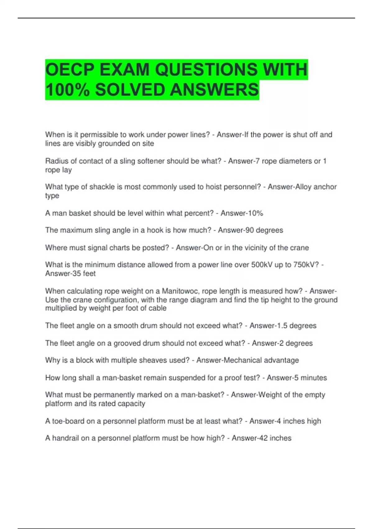 OECP EXAM QUESTIONS WITH 100% SOLVED ANSWERS When is it permissible to work under power lines? - Answer-If the power is shut off and lines are visibly grounded on site Radius of contact of a sling softener should be what? - Answer-7 rope diameters or 1 rope lay What type of shackle is most commonly used to hoist personnel? - Answer-Alloy anchor type A man basket should be level within what percent? - Answer-10% The maximum sling angle in a hook is how much? - Answer-90 degrees Where must signal charts be posted? - Answer-On or in the vicinity of the crane What is the minimum distance allowed from a power line over 500kV up to 750kV? - Answer-35 feet When calculating rope weight on a Manitowoc, rope length is measured how? - Answer-Use the crane configuration, with the range diagram and find the tip height to the ground multiplied by weight per foot of cable The fleet angle on a smooth drum should not exceed what? - Answer-1.5 degrees The fleet angle on a grooved drum should not exceed what? - Answer-2 degrees Why is a block with multiple sheaves used? - Answer-Mechanical advantage How long shall a man-basket remain suspended for a proof test? - Answer-5 minutes What must be permanently marked on a man-basket? - Answer-Weight of the empty platform and its rated capacity A toe-board on a personnel platform must be at least what? - Answer-4 inches high A handrail on a personnel platform must be how high? - Answer-42 inches If your driving at the speed of light and you turn on your headlights, do they work? - Answer-No, due to the quantum mechanics of quantum gravity theory (not needed) The sum of all angles in a rigging triangle (all triangles) are a total how many degrees? - Answer-180 degrees A vertical angle should never exceed what? - Answer-60 degrees What is the sling stress formula? - Answer-Sling length/vertical height=load factor Load factor times load weight/number of legs What is the capacity rating of a choker hitch? - Answer-75% The safe use of slings largely depends on what 4 important factors? - Answer-Size Hitch Angle Sharpness A horizontal angle of what should never be less than? - Answer-30 degrees What must be on the tag for alloy steel chain slings? - Answer-Size Grade Rated capacity Reach What must be on the tag for welded alloy steel chain slings? - Answer-Size Grade Rated capacity Manufacturer's name