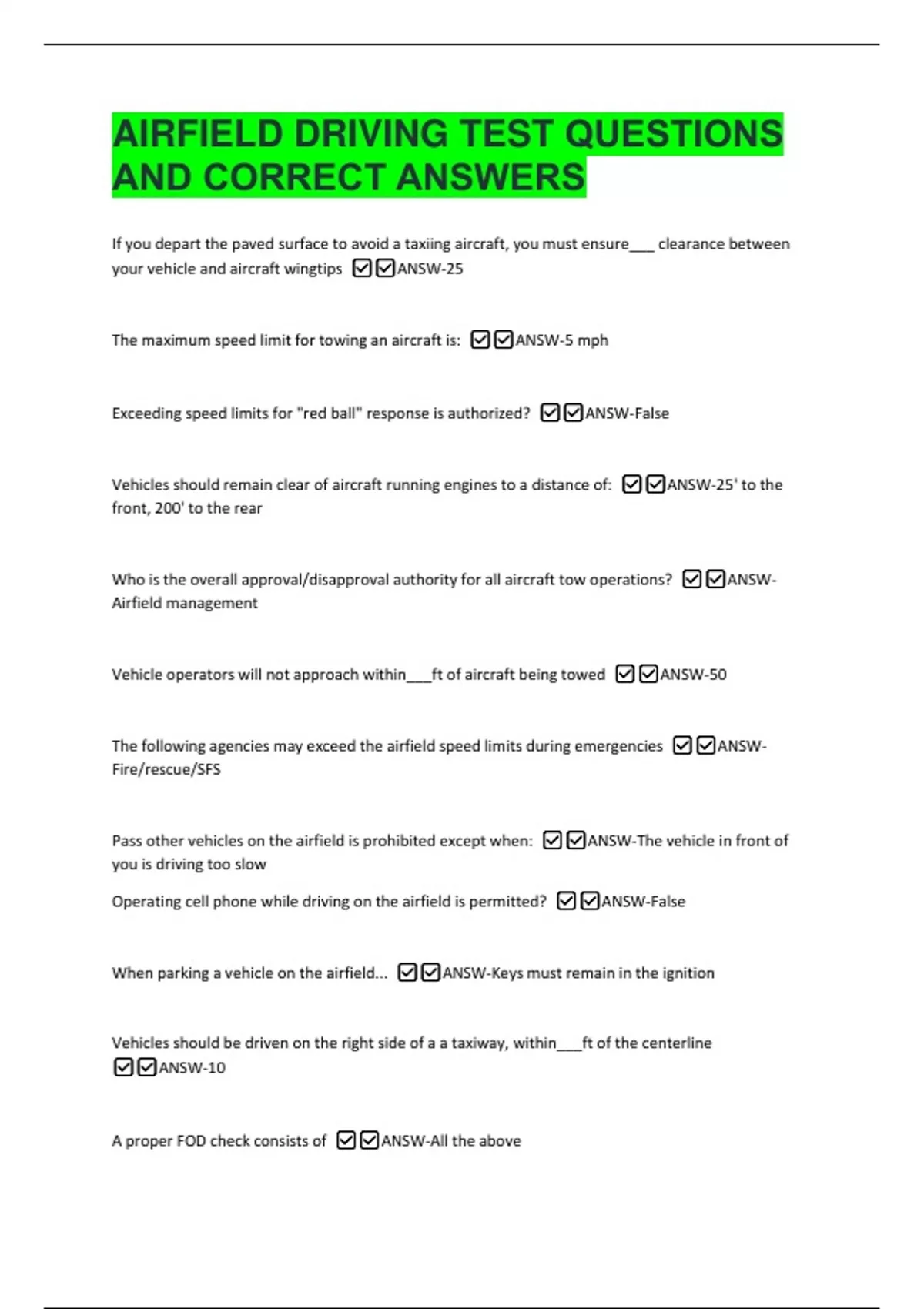 AIRFIELD DRIVING TEST QUESTIONS AND CORRECT ANSWERS If you depart the paved surface to avoid a taxiing aircraft, you must ensure___ clearance between your vehicle and aircraft wingtips ANSW-25 The maximum speed limit for towing an aircraft is: ANSW-5 mph Exceeding speed limits for "red ball" response is authorized? ANSW-False Vehicles should remain clear of aircraft running engines to a distance of: ANSW-25' to the front, 200' to the rear